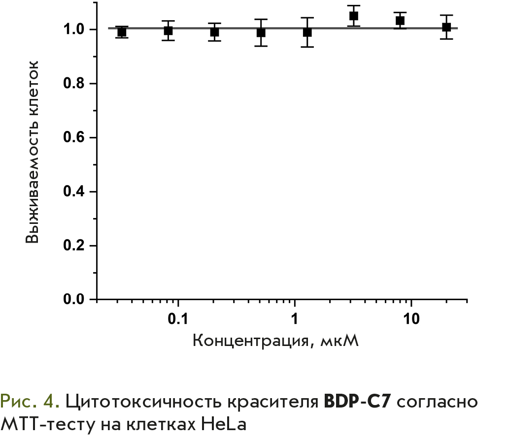 HeLa cells cultured in complete DMEM were seeded in a 96-well plate (104 cells/well) and grown overnight. Prior to testing, the culture medium was removed and 100 μL of a fresh medium containing BDP-C7 at the specified concentration and 1% DMSO was added. The BDP-C7 substance was tested in a concentrations ranging from 33 nM to 20 μM in three repeats. Sample solutions were prepared by serial 2.5-fold dilution of the concentrated sample. The culture medium containing 1% DMSO was added to the control cells. After overnight incubation, liquid was withdrawn, and 100 μL of 3-(4,5-dimethylthiazol-2-yl)-2,5-diphenyltetrazolium bromide (MTT) solution at a concentration of 5 mg/mL in a serum-free culture medium was added to each well and the cells were further incubated at 37°C for 3 h. The supernatant was then removed, and 100 μL of DMSO was added to dissolve the formazan crystals. The optical density was measured at 570 and 640 nm using an Infinite M1000 Pro plate reader (Tecan, Austria).