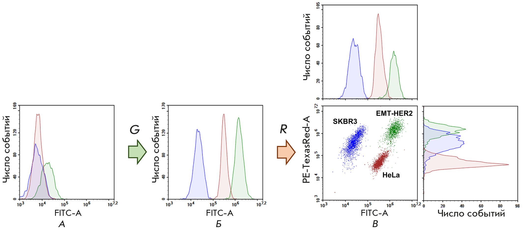 Fig. 5. Cytometric analysis of the SKBR3, HeLa, and EMT-HER2 cells, untreated (A), treated separately first with the green BDP-C7 dye at concentrations of 1, 10, and 100 nM, respectively (B), then with red ligand to the HER2 tumor marker (DARPin9_29-mCherry, C). An overlay of the results obtained for each cell line in parallel experiments. Data for HeLa are shown in red; for SKBR3, in blue; and for EMT-HER2, in green