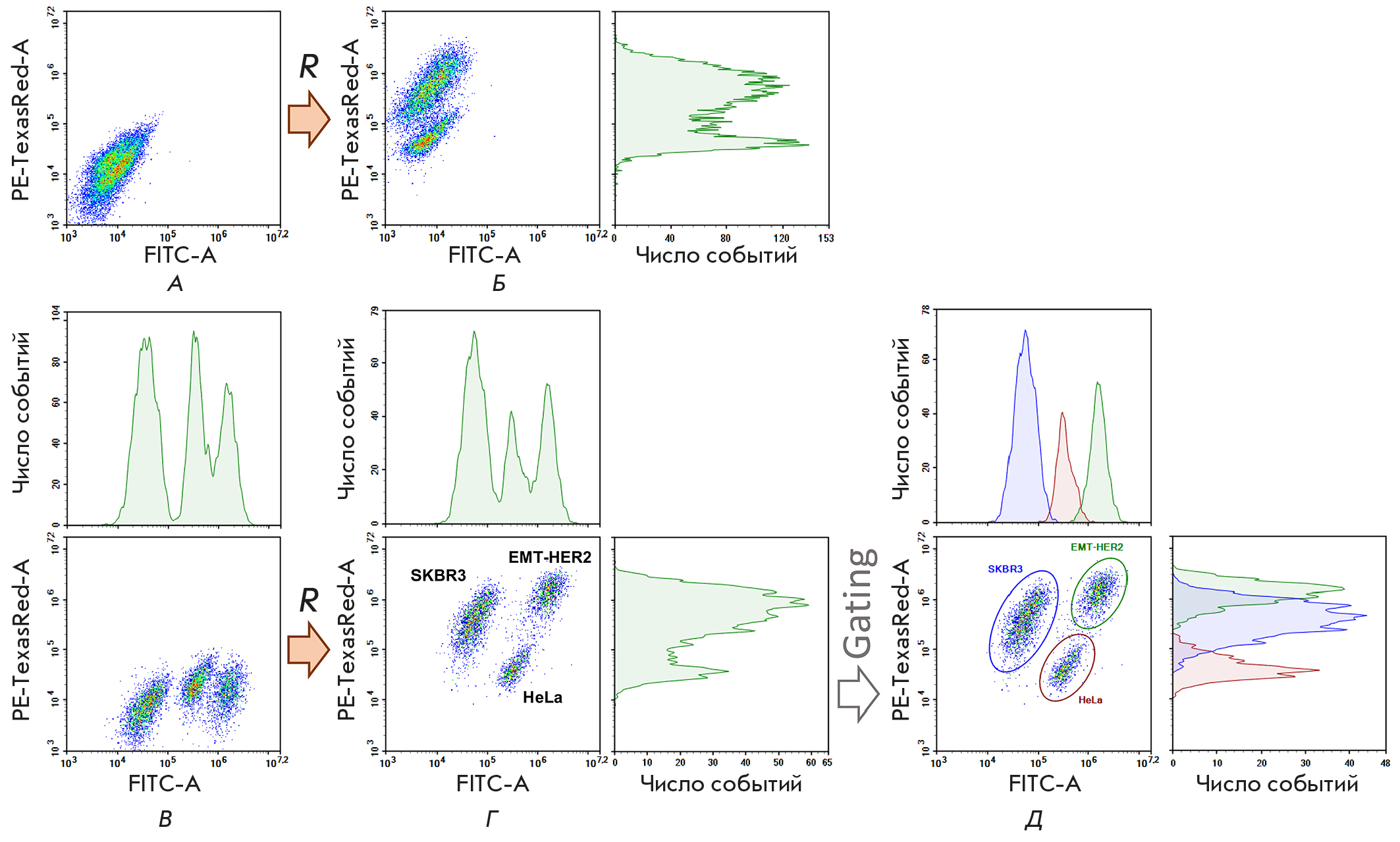 Fig. 6. Cytometric analysis of the HeLa, SKBR3, and EMT-HER2 cells mixed together before staining (A) and then treated with a red ligand to the HER2 tumor marker (DARPin9_29-mCherry, B). In (C), the cells were pre-stained with the green dye BDP-C7 at different concentrations, washed and mixed in a single test tube, and then treated with DARPin9_29-mCherry (D). (E) – identification of individual cell populations and analysis of their fluorescence in the green (FITC) and red (PE-Texas Red) channels
