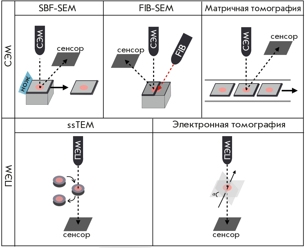 Fig. 2. Methods for obtaining three-dimensional images using TEM and SEM. Regardless of the type of microscopy, the first step is specimen preparation, which involves using polymer media to immobilize the specimen and then cut it into sections. Among specimen immobilization methods, the most popular techniques include fixation using methacrylate [8], cryofixation, freeze-fixation, and Tokuyasu cryosectioning [9]. The next step involves accumulating an array of 2D images using TEM or SEM. The recorded images should be aligned with the XY axes and potential rotation should be eliminated, being especially important for systems that study individual sections (ssTEM and array tomography). Next, the area that will be shown in the final image is selected from the resulting array. The final step is creating a full-fledged 3D image from the recorded 2D segments using specialized software