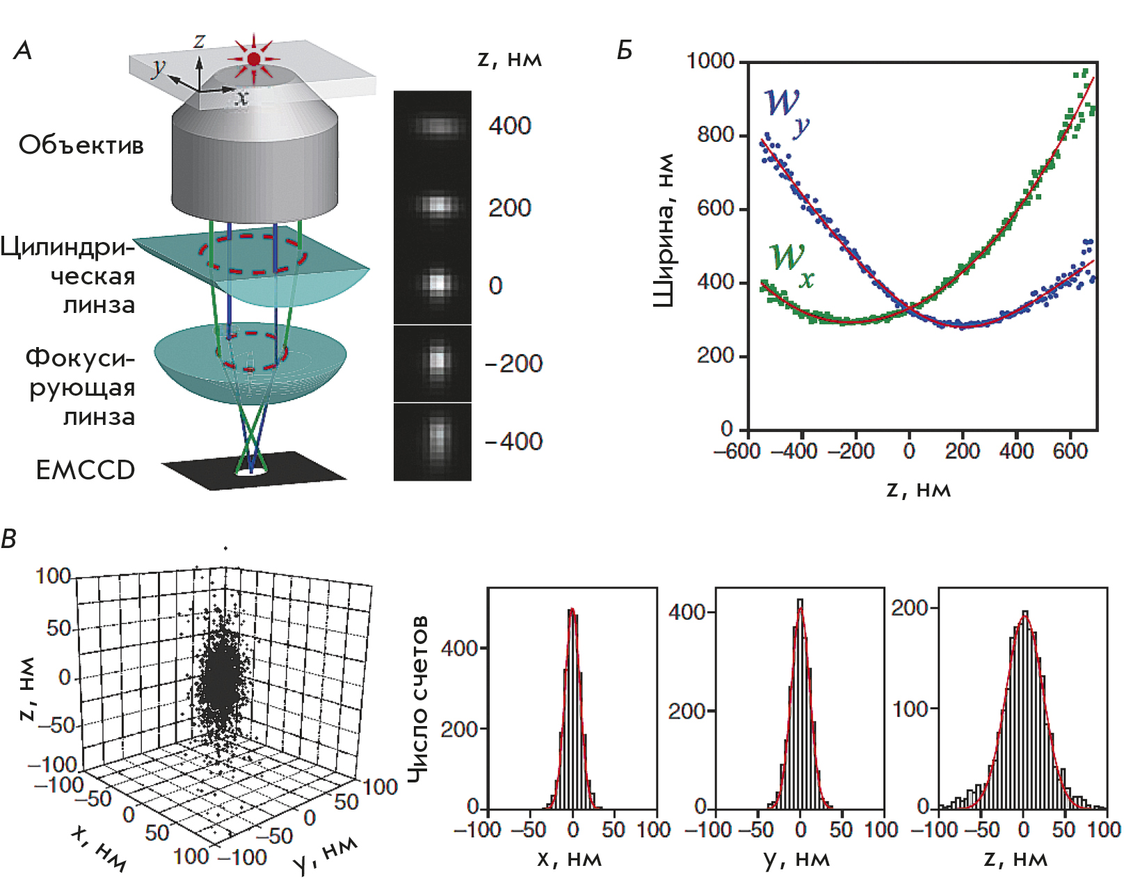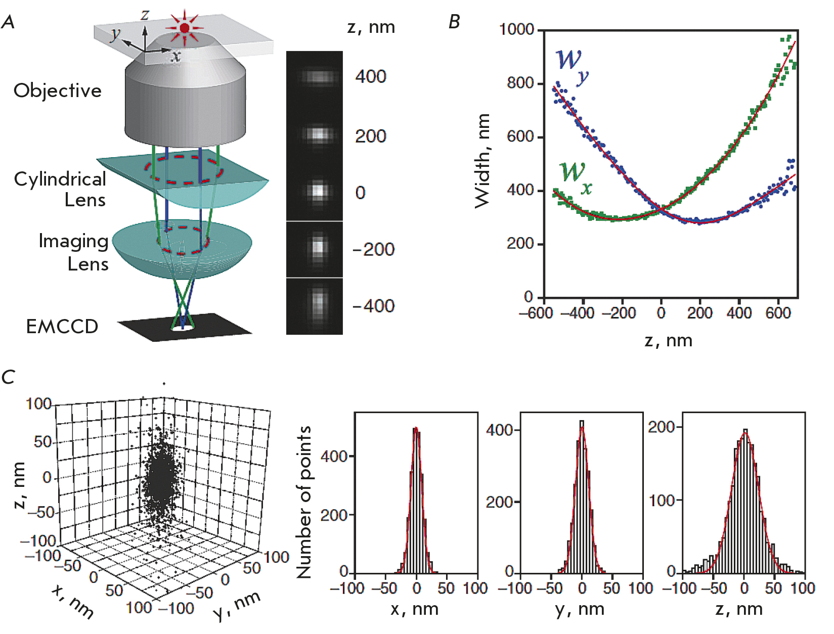 Fig. 6. The principle of the 3D STORM technique. (A) An optical scheme for determining the axial coordinate of a radiating object by analyzing the ellipticity of its image. The right panel shows images of the radiating object in the X and Y planes depending on its axial position. (B) Examples of the dependence of the ellipticity of the image of the emitting object (Alexa 647) for X and Y coordinates on focusing along the Z axis. (C) An example of the 3D distribution of single emitting objects and the corresponding histograms of the distribution in the X, Y, and Z directions. The figure was taken from ref. [45]