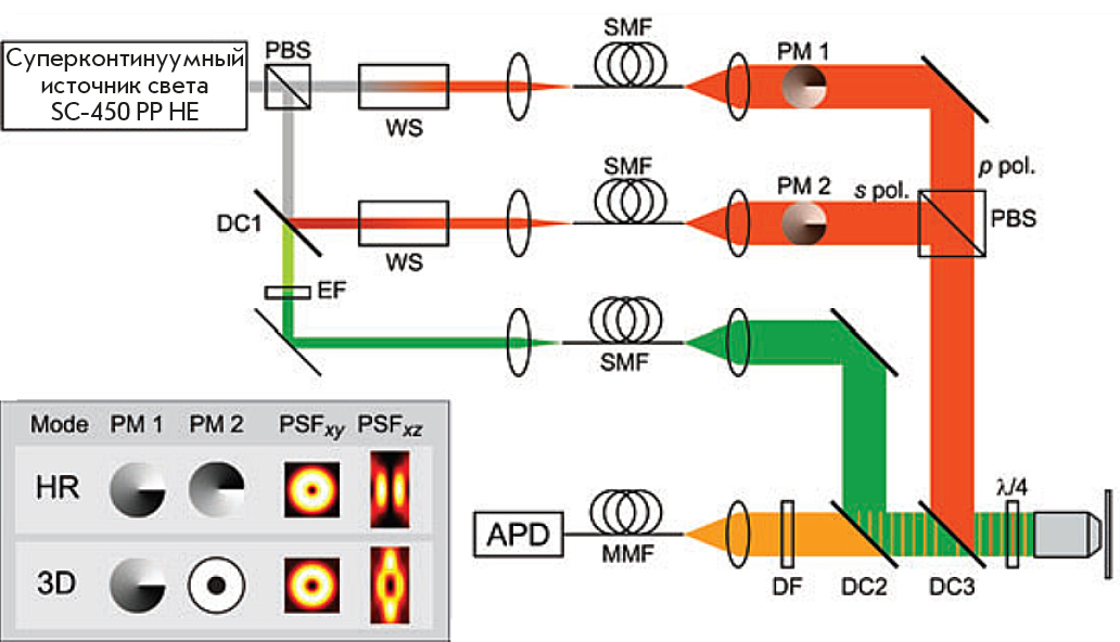 Strictly synchronized pulsed laser sources have conventionally been used in STED microscopy; their operating principle is as follows: a fluorescence-exciting pulse (~ 80 ps, shorter than the fluorescence lifetime) is followed by a STED pulse with a duration of ~ 250 ps, narrowing the spatial region. However, extension of STED microscopy to the visible spectrum necessitated the use of sophisticated nonlinear optics for pulse shaping and synchronization. It has been shown recently [63] that STED microscopy can be conducted using supercontinuum lasers, which greatly simplifies the hardware assemblies for STED microscopy and may contribute to wider implementation of this technique. Figure 8 shows a schematic diagram of the 3D-STED setup on a supercontinuum laser.