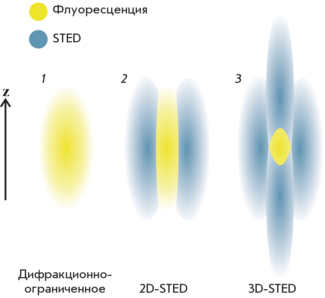 Fig. 9. Narrowing of the effective radiation area due to STED suppression of peripheral radiation. 1 – diffraction-limited fluorescent PSF. 2 – the torus-shaped STED beam narrows the diameter of the fluorescent PSF. 3 – fluorescent PSF in the case of 3D-STED