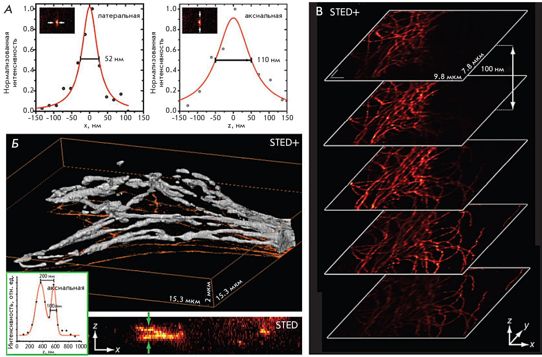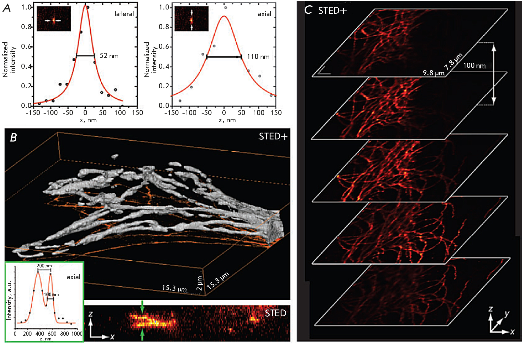 Fig. 10. The results obtained using the 3D-STED technique. (A) Spatial resolution of fluorescent nanoparticles 44 nm in diameter: 52 nm in the X-direction and 110 nm in the axial (Z) direction. (B) A 3D image of fluorescently labeled microtubules: visualization of the isosurface (top) and projection of maximum intensity along the Y axis (bottom) – 30 sections. The inset shows the intensity profile at the specified location. (C) Sections obtained at a 100 nm increment in the Z direction. The figure was taken from ref. [61]