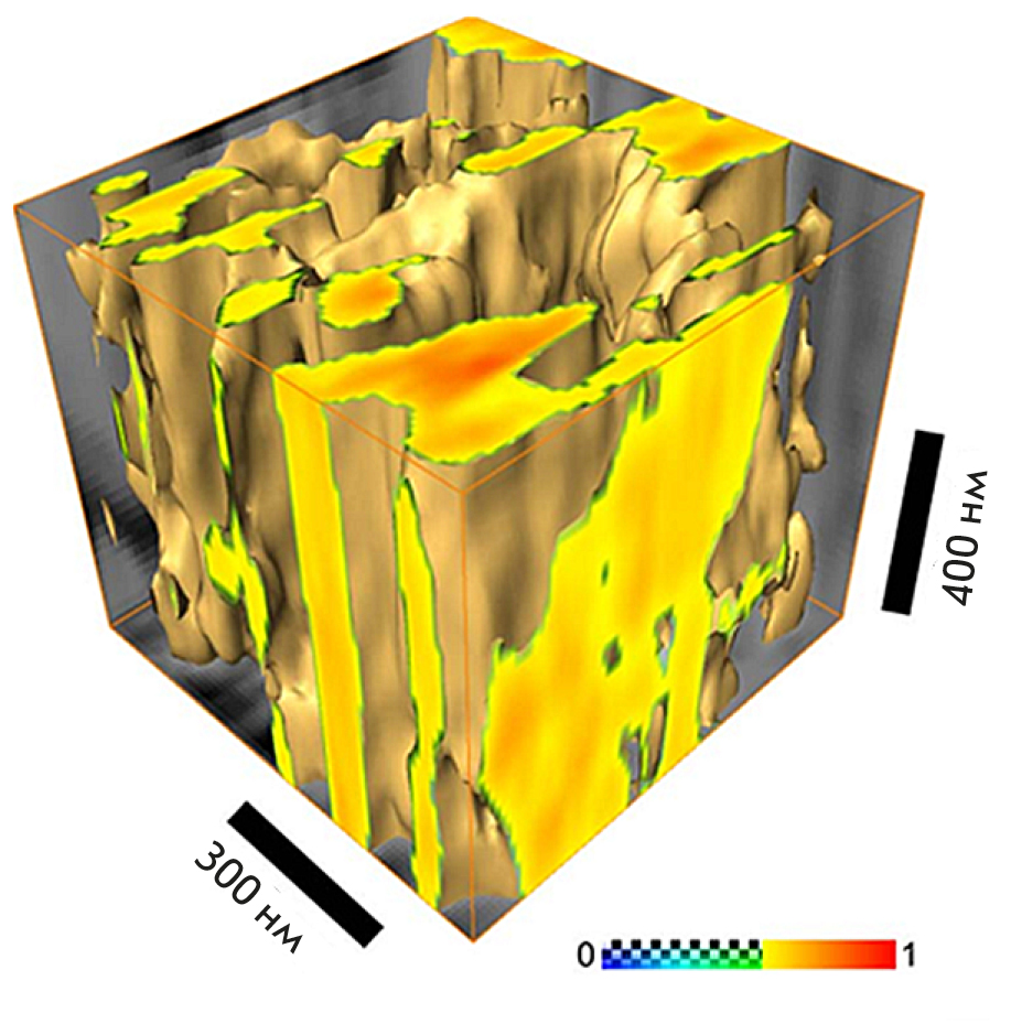 Fig. 11. Tomographic reconstruction of a section of human bone, 256 × 256 × 19 voxels, step-by-step chemical etching of 80 nm. The color scale is the value of the phase shift of the SPM probe oscillations normalized to unity. The figure is borrowed from ref. [70]