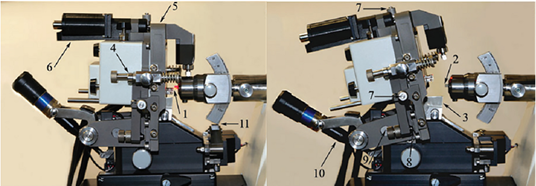 Fig. 12. A setup for implementing the SPM-UMT procedure: Ntegra Tomo unification methodology (NT-MDT, Russia). The left panel is the working position for carrying out SPM measurements; the right panel – the SPM head is reserved for performing the UMT cut. (1) SPM probe holder; (2) test specimen; (3) UMT knife holder; (4) SPM-head supports; (5) SPM-head support platform; (6) SPM-head motorized supply system; (7) micrometer screws of the SPM-head positioner; (8) polycorundum support plates; (9) SPM-head hinge fastening system; (10) the system of motorized removal of the SPM-head to bring it to the position of the UMT-cut; and (11) The restrictive support of the UMT console. The figure was taken from ref. [73]