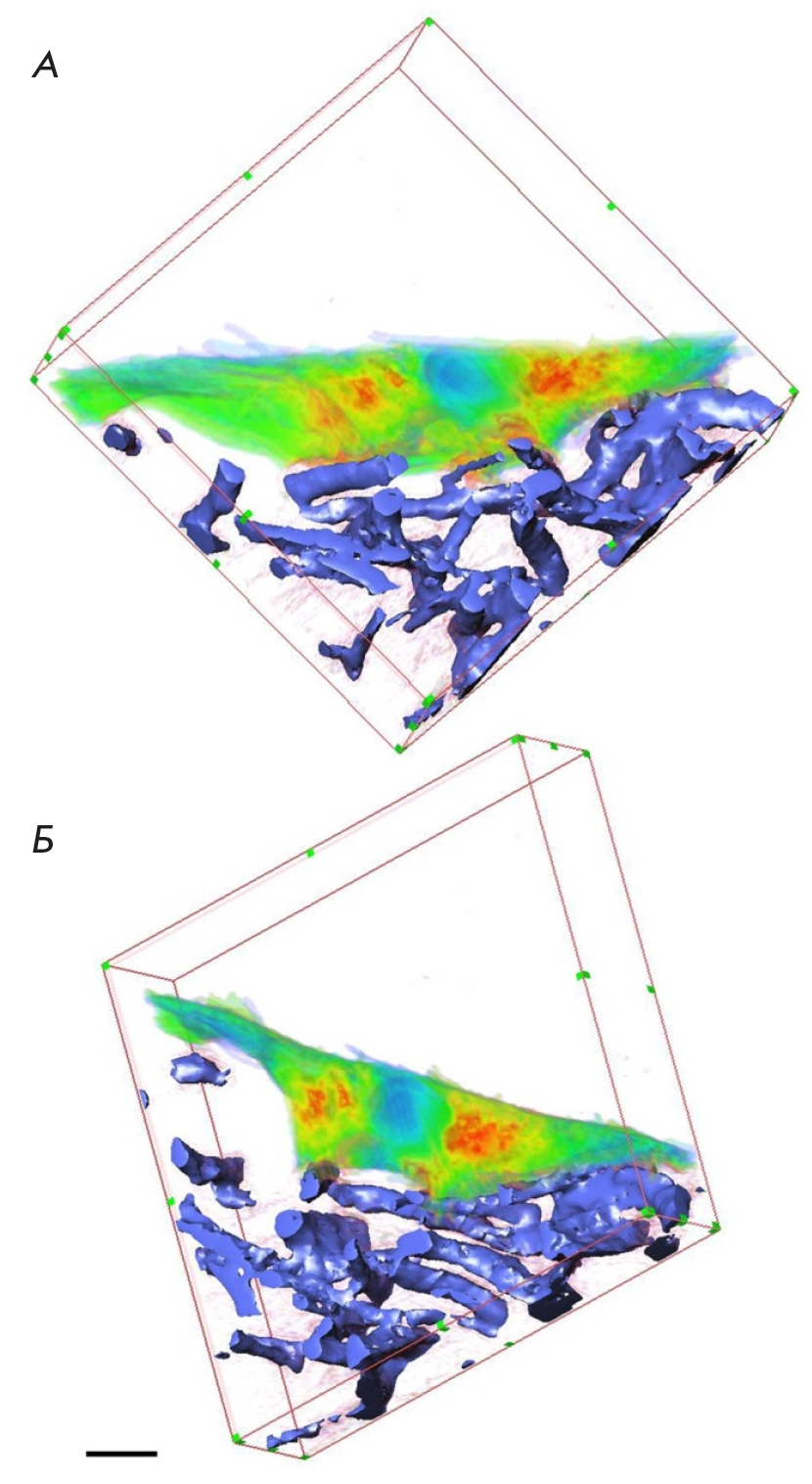 Fig. 14. Visualization of the 3D SPNT reconstruction of a fibroblast fragment (shown with green and red) and surrounding polyurethane fibers (blue), 23 sections 150 nm thick, reconstructed volume 32.0 × 32.0 × 3.3 µm, scale bar is 3 µm. The reconstructed fibroblast fragment is shown in two views (A and B). The measurements were carried out in the phase contrast mode under normal atmospheric conditions at room temperature. The figure was taken from ref. [84]