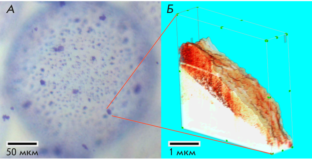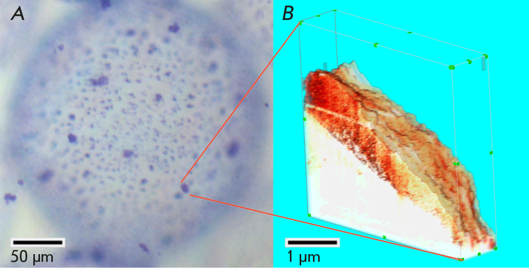 Fig. 15. Cryo-SPNT reconstruction of a single microparticle of the rat liver extracellular matrix on the surface of an alginate microcarrier performed at –120°C: (A) optical microscopy, Coomassie Brilliant Blue R-250 staining;(B) 3D cryo-SPM reconstruction of a single rat liver extracellular matrix microparticle obtained from 13 sequential cryo-SPM images of the microparticle surface on a spherical alginate microcarrier after successive 80-nm thick cryosections. The reconstructed volume is 5.0 × 5.0 × 1.1 µm. The resolution of each 2D SPM scan is 400 × 400 pixels. The pseudocolor palette corresponds to the phase shift of the SPM probe oscillations normalized to unity. The figure was taken from ref. [87]