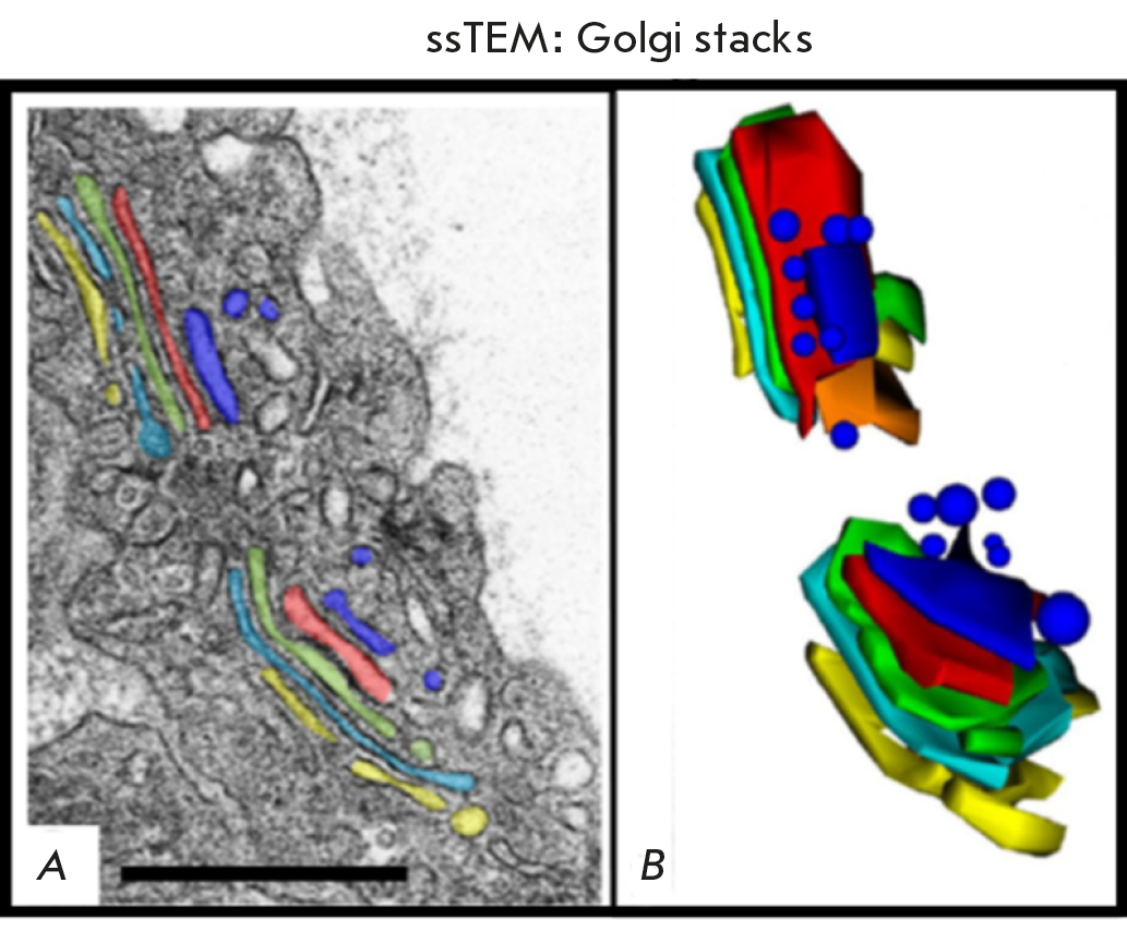 Fig. 3. An ssTEM image of Golgi stacks in the mouse lung cell AE1. (A) One of the EM microphotographs of the series with color manual segmentation. (B) A 3D model of Golgi stacks obtained in TEM based on nine consecutive sections with manually segmented tanks of both stacks. Scale range: 500 nm. The figure was taken from ref. [6]