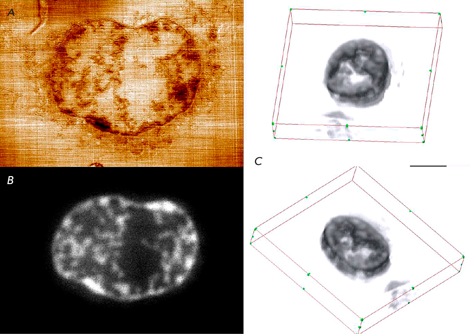 Fig. 16. Analysis of human breast adenocarcinoma MCF-7 cell samples with doxorubicin. (A) An SPM image of the topography of the cut surface of the MCF-7 cell, scan size 13.8 × 9.5 µm; height variation range, 33.5 nm; (B) fluorescent image of a cut of the same area of the MCF-7 cell; (C) 3D reconstruction of doxorubicin distribution in the volume of the MCF-7 cell sample, 22.5 × 18.7 × 2.4 µm; section thickness, 120 nm; the dimensional segment, 5 µm; visualization is presented in two views. The figure was taken from ref. [92]