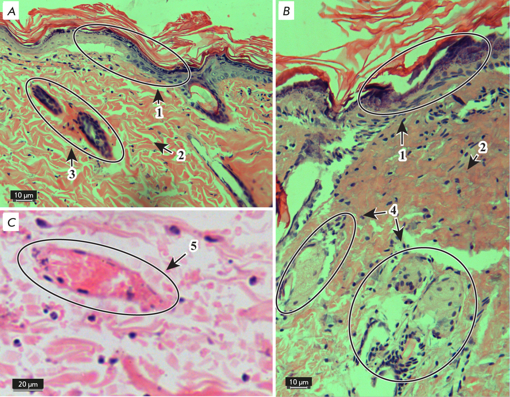 Fig. 4. Morphological changes in the skin with burn injury 24 h after application of liposomes with 26% of phosphatidylcholine. Hematoxylin and eosin stain.×20 (A, B) and×40 (C) objectives.1 – epidermis,2 – dermis,3 – hair follicles,4 – sebaceous glands,5 – blood vessels