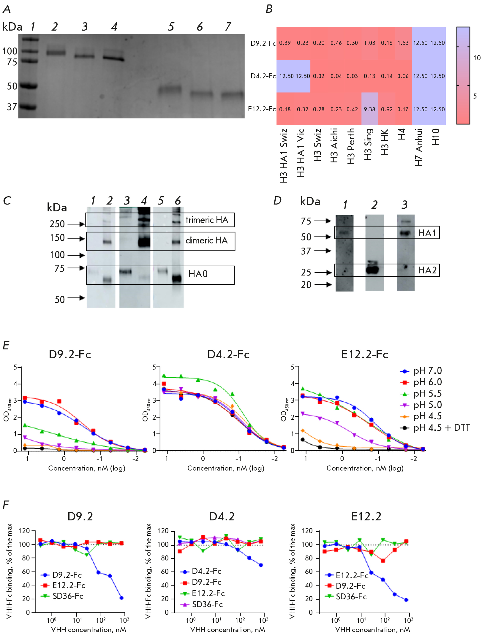 Fig. 2. Production of VHH-Fc fusion proteins and their characterization in vitro: (A) – SDS-PAGE of purified VHH-Fc under non-reducing (2–4) and under reducing (5–7) conditions: molecular weight ladder (1), D9.2-Fc (2, 5), E12.2-Fc (3, 6), and D4.2-Fc (4, 7); (B) – binding characteristics of VHH-Fc in relation to different Group 2 HA proteins, expressed as EC50 (nM) based on the ELISA assay results;(C) – Western blot analysis of the antibody specificity of D9.2-Fc (1, 2), D4.2-Fc (3, 4), and E12.2-Fc (5, 6) to H3 Swiz HA0 under reducing (1, 3, 5) and non-reducing (2, 4, 6) conditions;(D) – Western blot analysis of VHH-Fc specificity to HA1 and the HS2 subunit of the HA protein: inactivated A/Aichi/2/1968 IAV under reducing conditions, detected using D9.2-Fc (1), D4.2-Fc (2), and E12.2-Fc (3);(E) – ELISA demonstrating binding of VHH-Fc to H3 Aichi HA0 cleaved by trypsin-TPCK and incubated in buffer solutions with different pH and DTT; (F) – competitive ELISA for identification of VHH-Fc epitopes