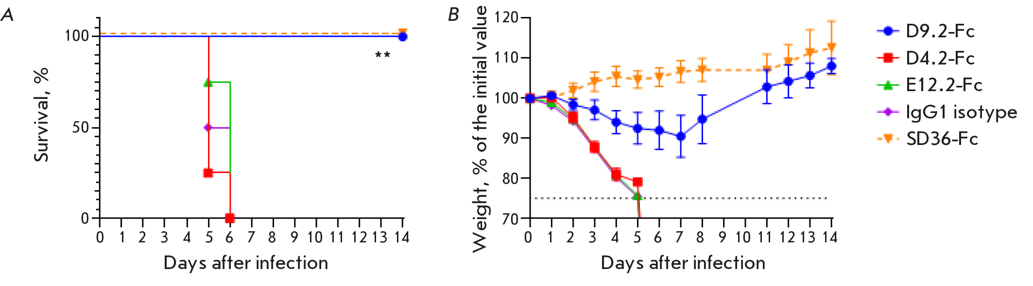 Fig. 3. The preventive effectiveness of VHH-Fc in vivo: (A) – survival curves, only the differences between the control and D9.2-Fc groups are shown (**p = 0.002); (B) – body weight curves for surviving mice, data are presented as mean values ± SEM