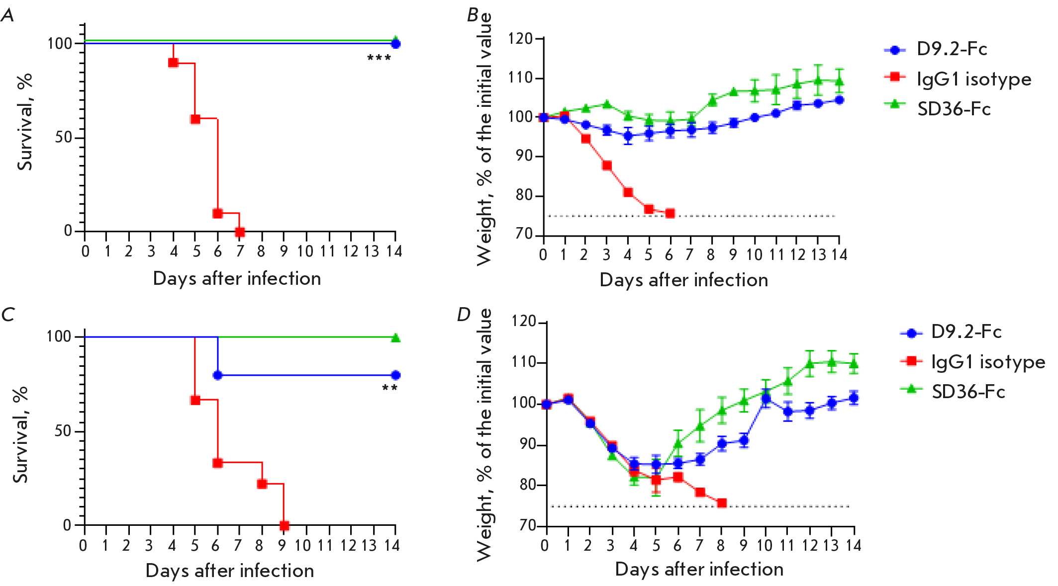 Fig. 4. The effectiveness of D9.2-Fc in preventive (A) and (B) and therapeutic (C) and (D) regimens in vivo:(A) and (C) – survival curves (***p = 0.0002, **p = 0.0021); (B) and (D) – body weight curves for surviving mice, data are presented as mean values ± SEM