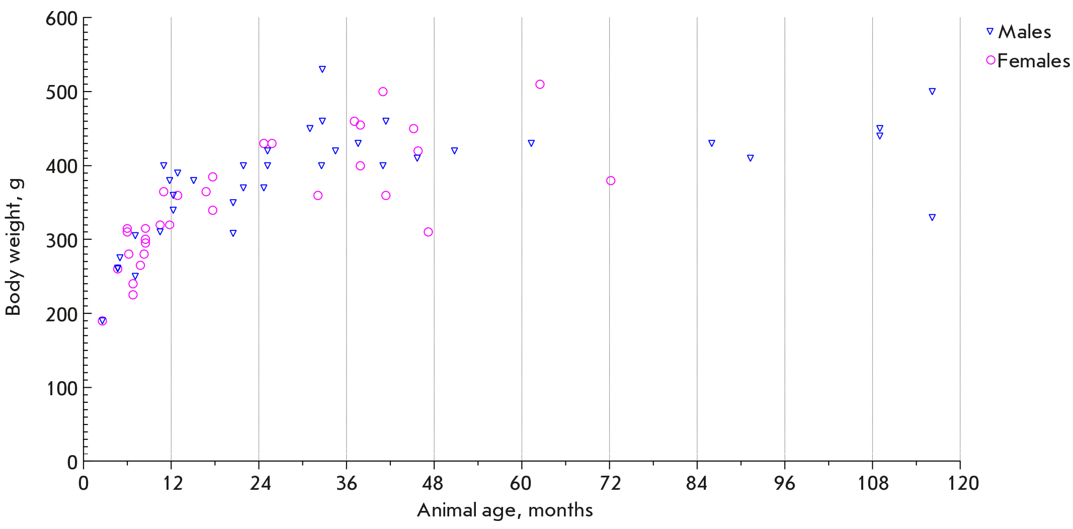 The body weight of CMs increased rapidly during their first 1.5 years of life. By the age of 18–20 months, the mean body weight of the animals had reached 400 g and stayed at the same level in all studied CMs aged up to 9.6 years. No significant differences in body weight were detected between the males and females (Mann–Whitney test, p = 0.0823).