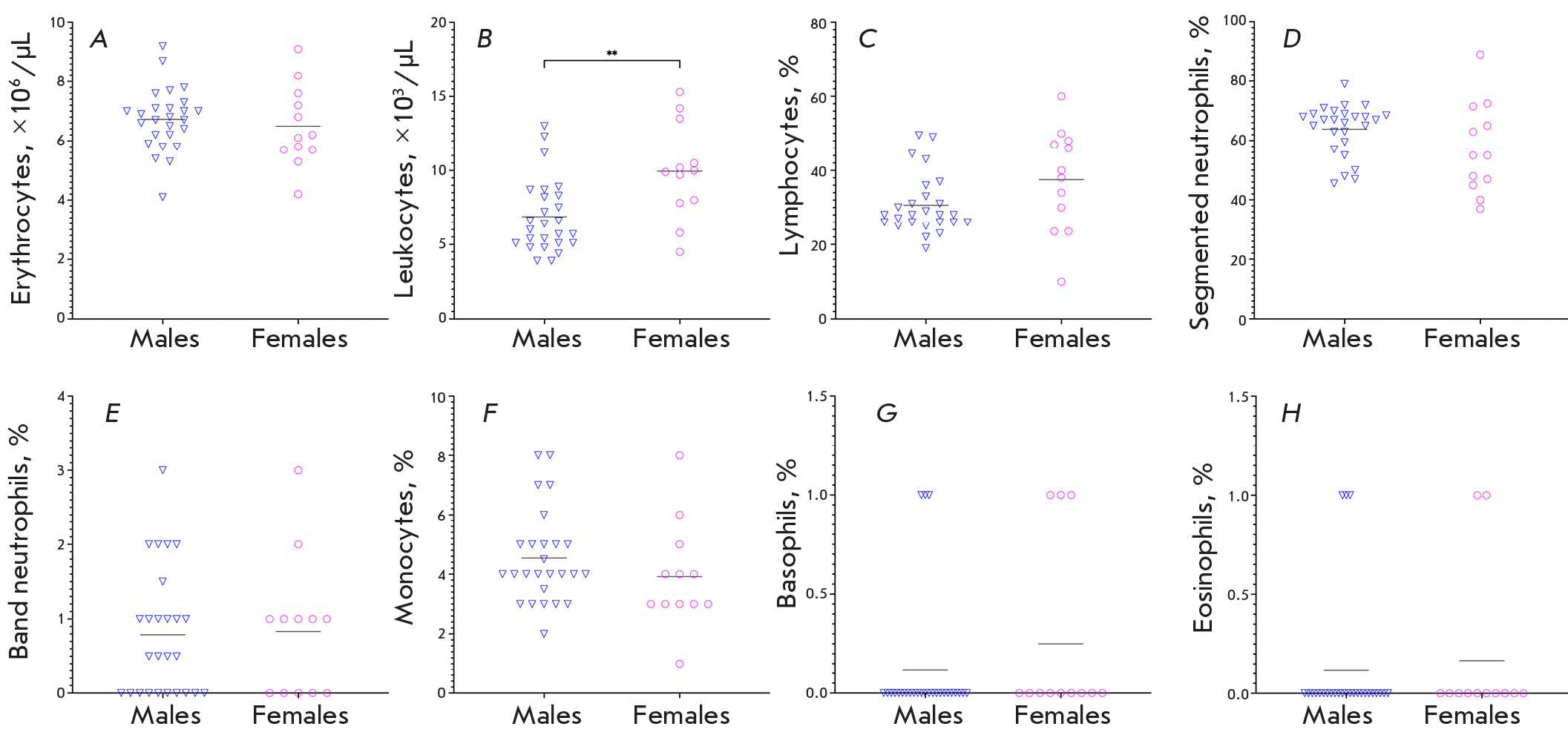 Fig. 3. Counts of (A) erythrocytes, (B) leukocytes, and the percentage of (C) lymphocytes, (D) segmented neutrophils, (E) band neutrophils, (F) monocytes, (G) basophils and (H) eosinophils in the leukocyte differential in the blood of laboratory-bred common marmosets (N = 38). Horizontal lines show the mean value. The statistical significance of the differences in the studied parameters between males and females was assessed using the Mann–Whitney test. **statistically significant differences (p < 0.05)