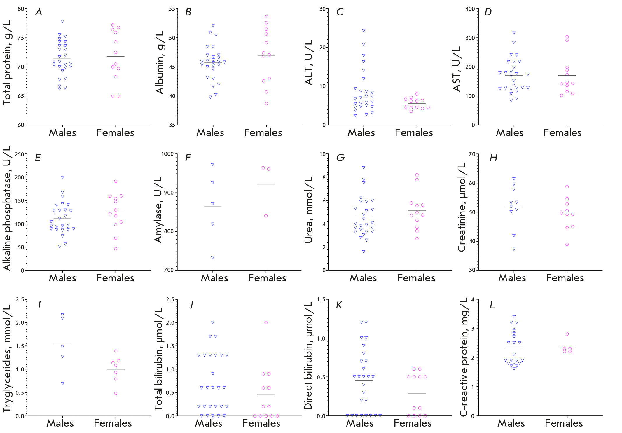 Fig. 4. Serum chemistry parameters in laboratory-bred common marmosets. (A) Total protein level; (B) albumin level; (C) ALT activity; (D) AST activity; (E) alkaline phosphatase activity; (F) amylase activity; (G) urea level; (H) creatinine level; (I) triglyceride level; (J) total bilirubin level; (K) direct bilirubin level; and (L) C-reactive protein level are presented. For creatinine, N = 20; for triglycerides, N = 12; for amylase, N = 8; for C-reactive protein, N = 26; and for other parameters, N = 38. Horizontal lines represent the mean value. The statistical significance of the differences in the studied parameters between males and females was assessed using the Mann–Whitney test