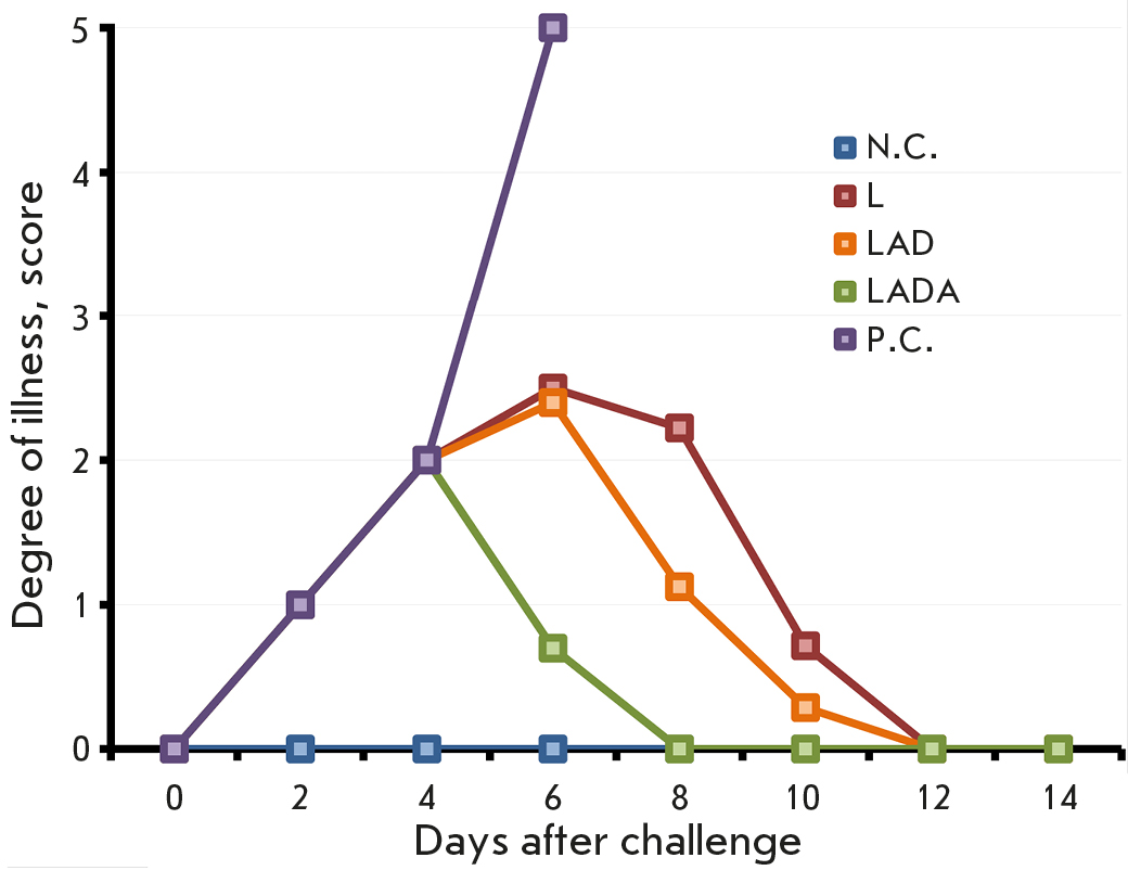 Fig. 3. The dynamics of the clinical manifestations of the infection in mice vaccinated with the L, LAD, or LADA viruses at a dose of 105 PFU after intranasal infection with CPXV GRI-90 at a dose of 460 LD50 on day 62 after immunization. The data are presented for groups comprising 10 animals that were immunized with the respective viruses, as well as groups that were neither immunized nor infected (N.C.) or infected with CPXV (P.C.)