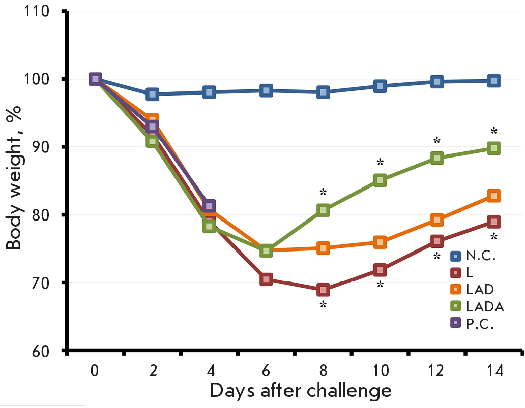 Fig. 4. The dynamics of the changes in body weight in mice vaccinated with the L, LAD, or LADA viruses at a dose of 105 PFU after their intranasal infection with CPXV GRI-90 at a dose of 460 LD50 on day 62 after immunization. The data are presented for groups comprising 10 animals that were immunized with the respective viruses, as well as groups that were neither immunized nor infected (N.C.) or infected with CPXV (P.C.). *Statistically significant differences with P < 0.05 in the mean values between the LADA and L groups