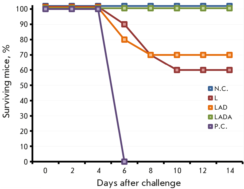 Fig. 5. The dynamics of the death of mice vaccinated with the L, LAD, or LADA viruses at a dose of 105 PFU after their intranasal infection with CPXV GRI-90 at a dose of 460 LD50 on day 62 after immunization. The data are presented for groups comprising 10 animals that were immunized with the respective viruses, as well as groups that were neither immunized nor infected (N.C.) or infected with CPXV (P.C.)
