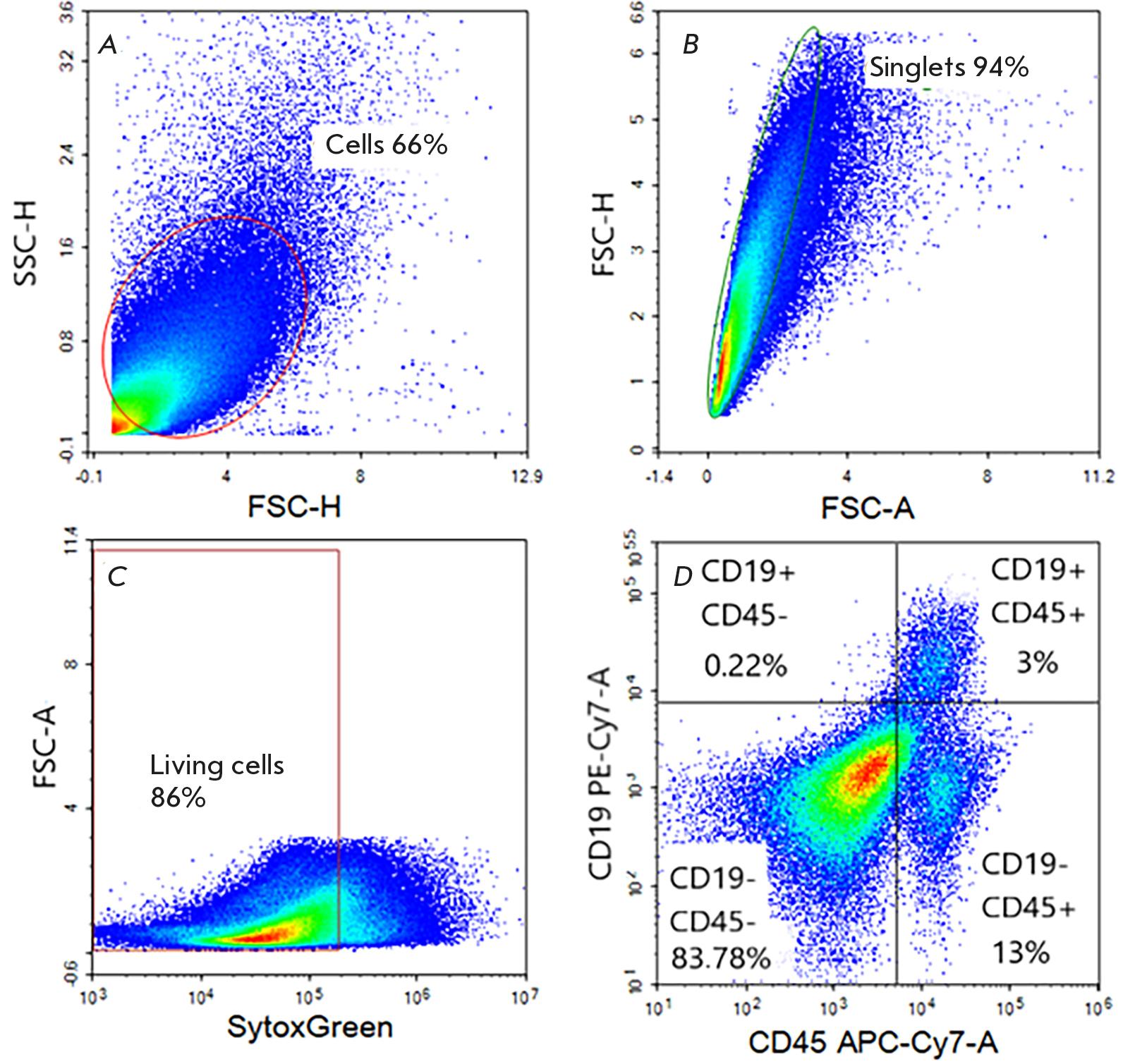 Fig. 2. Sequential gating strategy for assessing the fraction of tumor-infiltrating B cells. (A) The oval area denotes cells assigned to the tumor cell population based on lateral and forward light scattering data. (B) The oval area highlights single cells. (C) The rectangular area denotes the living cell population. (D) The image is divided into quadrants that are related to the CD45–/CD19–, CD45–/CD19+, CD45+/CD19–, and CD45+/CD19+ cell subsets. The CD45+/CD19+ cell subset corresponds to B cells