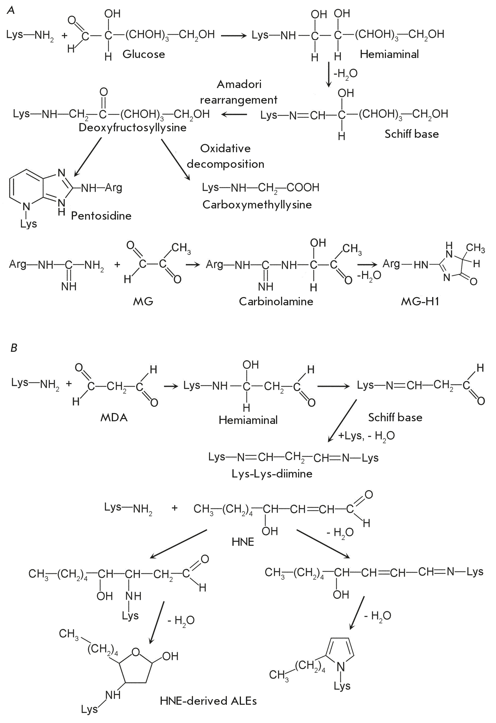 Similar processes are observed within living cells. Glucose and its oxidation products can launch an electrophilic attack on the ε-amino group of lysine (Fig. 1A). As a result, an unstable primary glycation product, a hemiaminal, is formed, with the glycation process being reversible at this stage. However, dehydration of the hemiaminal leads to a Schiff base formation, which then rapidly undergoes Amadori rearrangement, resulting in deoxyfructosyllysine. Further spontaneous reactions lead to the intracellular accumulation of advanced glycation end products (AGEs). AGEs classification is commonly predicated on their carbonyl precursors and/or intermediates [24]. AGEs exhibit significant structural heterogeneity, encompassing diverse aliphatic, aromatic, and heterocyclic moieties [17]. Carboxymethyllysine constitutes the most prevalent product of the Maillard reaction. The pentosidine cross-linking between modified lysine and arginine residues also serves as an indicator of protein glycation [25].