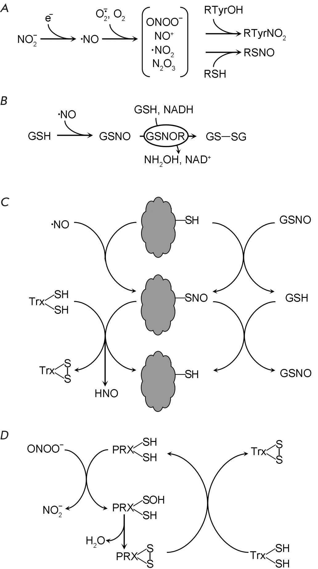 Fig. 3. The effect of reactive nitrogen species on proteins. (A) The general scheme of nitric oxide (•NО) formation, its conversion into chemically active species and incorporation into proteins, (B) Glutathione (GSH) nitrosylation and nitrosoglutathione (GSNO) denitrosylation with nitrosoglutathione reductase (GSNOR), (C) Nitrosylation, transnitrosylation and denitrosylation of proteins,
