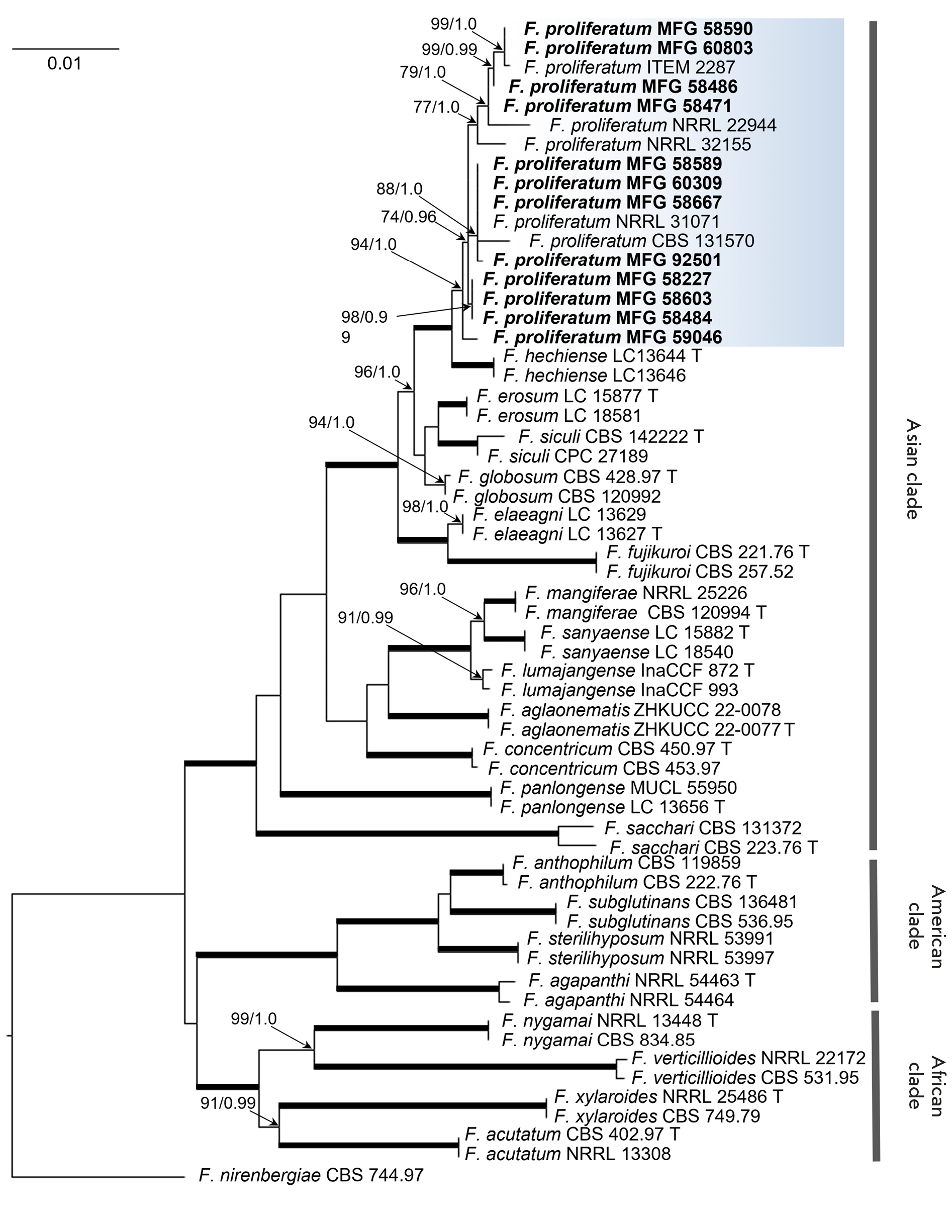 Fig. 2. Dendrogram of phylogenetic similarity of Fusarium spp. based on combined nucleotide sequences of the tef, tub, and rpb2 gene fragments by the ML method. Nodes show bootstrap support values (> 70%) in the ML analysis, as well as BP values (> 0.95). The thickening of lines signifies support at the 100/1.0 ML/BP level. Strains within the study, obtained from the MFG collection, are denoted in bold. F. nirenbergiae strain CBS 744.97 was designated as the outgroup
