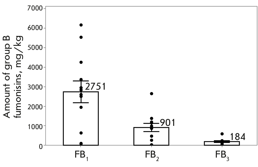 Fig. 3. Fumonisins production by F. proliferatum strains (autoclaved rice, 25°C, 14 days, in the dark). Presented are the mean values and the confidence intervals at a significance level of p < 0.05. The dots indicate the values for individual strains