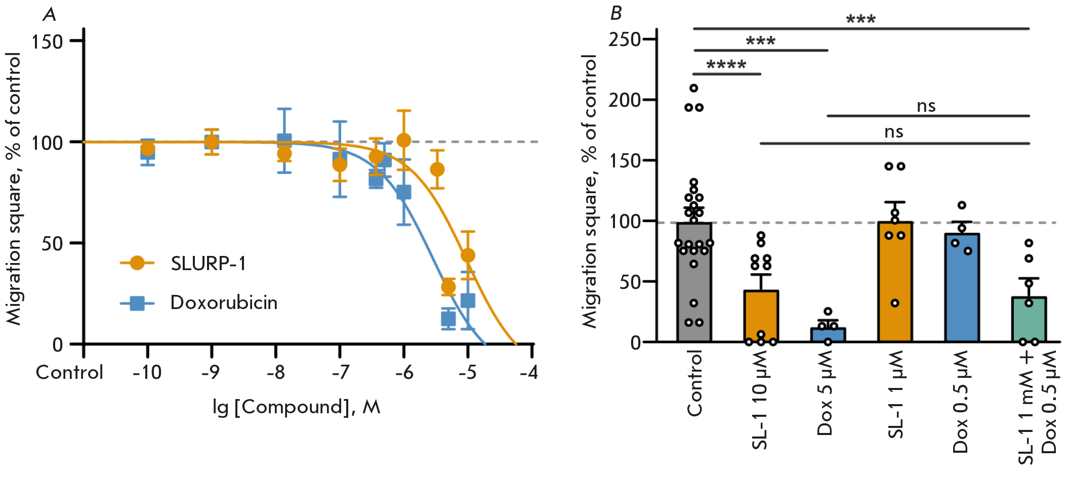 (A) Effect of different SLURP-1 and doxorubicin concentrations on cell migration. Data are presented as the mean scratch surface occupied by migrating cells (% normalized to the control), ± SEM, n = 3–22. The data obtained was approximated using a Hill equation. The Control level (100%) is shown with a dashed line.