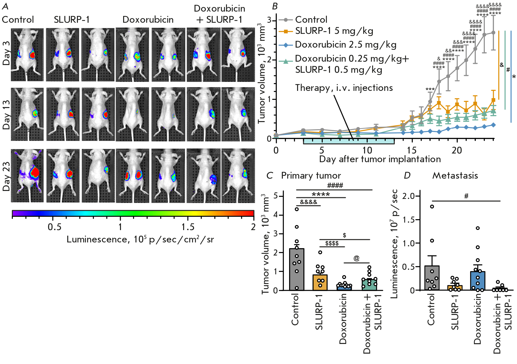 Fig. 3. The influence of SLURP-1, doxorubicin, and their combination on tumor growth and metastasis in a A431/NanoLuc mice xenograft model.