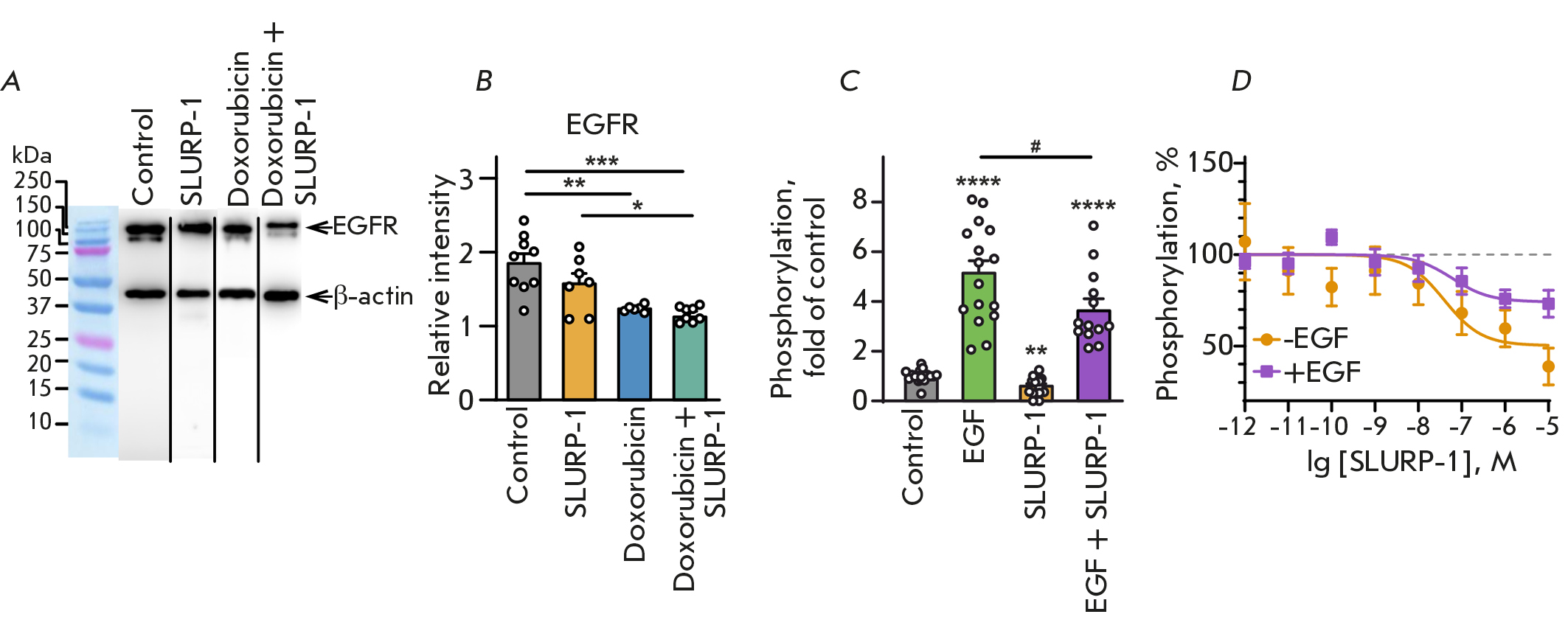 To assess the influence of SLURP-1 and doxorubicin on EGFR expression, the tumors (0.05 mg per sample) were homogenized, solubilized in 2% Triton X-100, and diluted in non-reducing PAGE buffer. Western blotting was performed with primary antibodies (sc-120, Santa Cruz, USA, 1 : 1 000) and secondary antibodies (715-035-150, Jackson Immunoresearch, USA, 1 : 5 000) for EGFR detection. The HRP signal was detected with the ECL substrate (Bio-Rad, USA) using an ImageQuant LAS 500 chemidocumenter (GE Healthcare, USA). Data were processed using the ImageJ 1.53t software (NIH, USA).