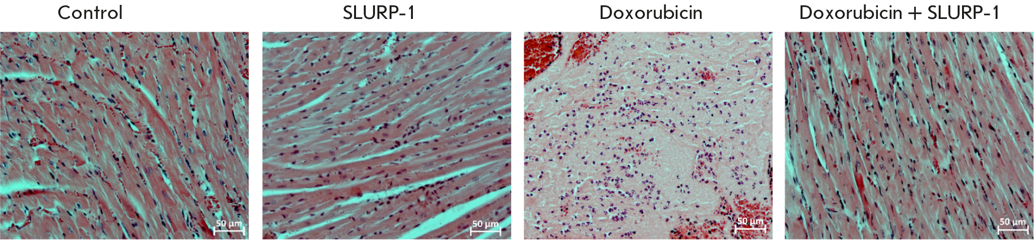 Fig. 5. Cardiotoxicity of the SLURP-1 and doxorubicin treatment. Heart fragments of mice treated with saline (control), SLURP-1 (5 mg/kg), doxorubicin (2.5 mg/kg), and SLURP-1 (0.5 mg/kg) + doxorubicin (0.25 mg/kg). Extensive focus of cardiomyocyte necrosis with neutrophil infiltration in the heart of mouse from the doxorubicin group was revealed. Hematoxylin and eosin staining, magnification ×200