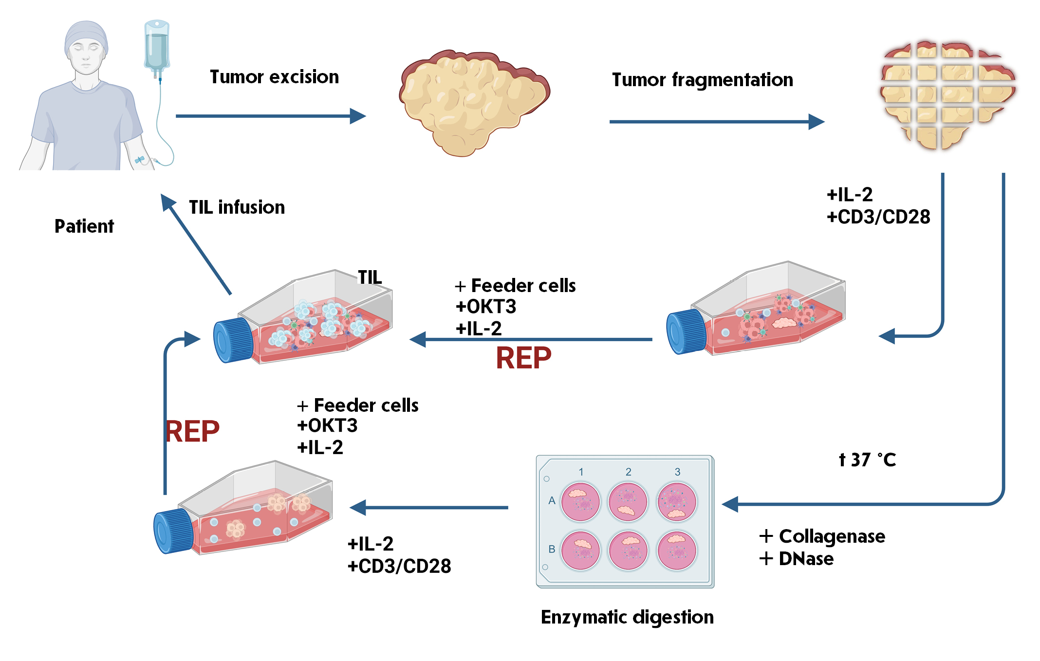 Fig 1. Preparation and infusion of TILs obtained from freshly resected tumor tissue. The two most common options are shown: obtaining TILs from tumor fragments and by enzymatic digestion. Regardless of the type of pre-REP stage of TIL production, at the second stage (REP), feeder cells need to be added to ensure large-scale expansion before infusing the cellular product into the patient