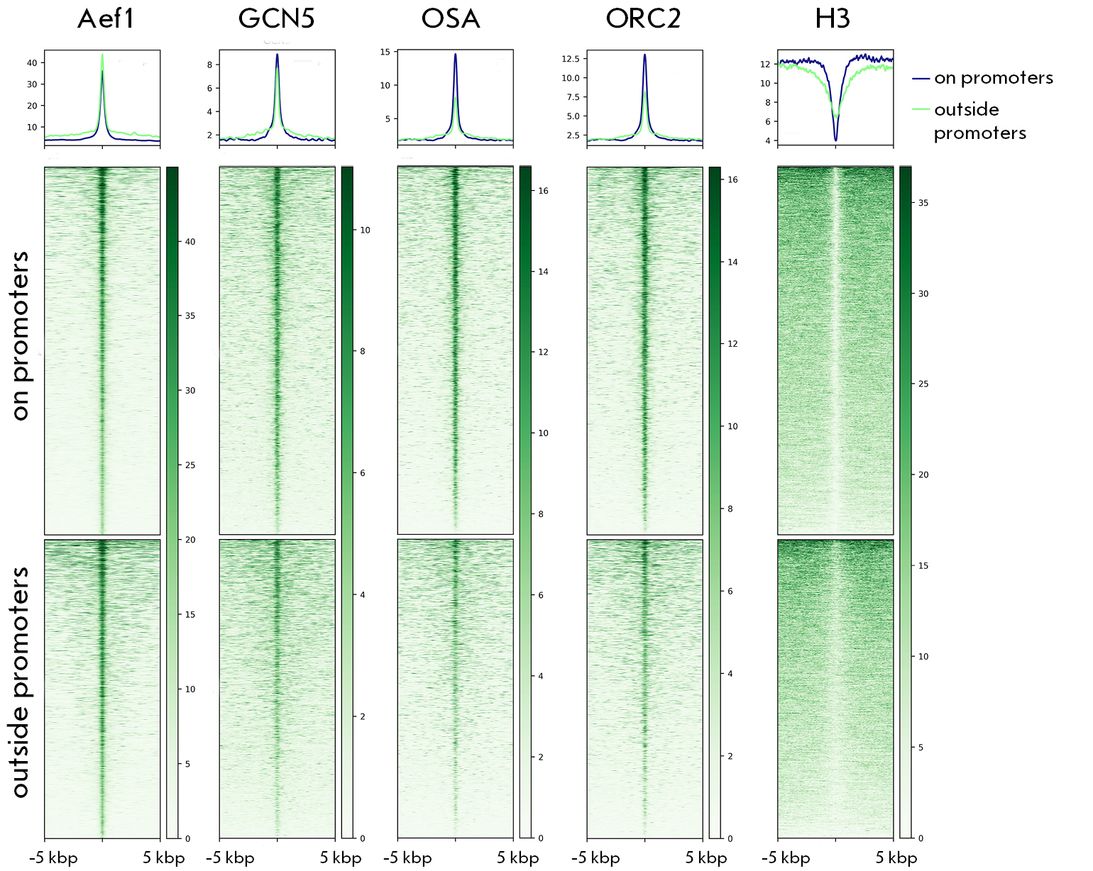 Fig. 1. Genomic colocalizations of Aef1 binding sites with GCN5 (the SAGA complex), OSA (the dSWI/SNF complex), ORC2 (the ORC complex), and histone H3. The names of the respective proteins are displayed at the top of the panels. Data are shown for Aef1 sites located in promoters (the middle panel) and outside promoters (the lower panel). The upper panel displays averaged profiles. The blue line represents the profile of proteins located at Aef1 promoter sites, while the green line represents the profile of the proteins on Aef1 sites outside promoters