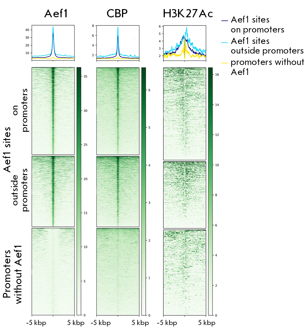 We noticed that CBP and H3K27Ac also tag the Aef1 binding sites residing in promoters and analyzed another group of sites; namely, the promoters lacking the Aef1 protein (Fig. 2, lower panels). An analysis of these sites revealed low CBP and H3K27Ac levels. Hence, recruitment of CBP and the high-intensity H3K27Ac signal at Aef1-carrying promoters correlate with the presence of an Aef1 binding site rather than with the promoter in general.