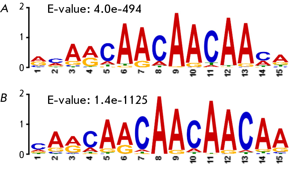 We decided to identify the potential consensus motif responsible for Aef1 binding at promoters and outside them using the MEME-ChIP software. An identical consensus motif (CAA)n was identified in both groups of sites (Fig. 3), which had been identified previously across the entire set of sites [26], suggesting that both groups of sites appear owing to the DNA-binding properties of Aef1 per se rather than via looping of other regulatory elements. These findings are consistent with the data showing that an experimentally confirmed Aef1 binding site within the adh gene enhancer contains the CAACAA sequence.