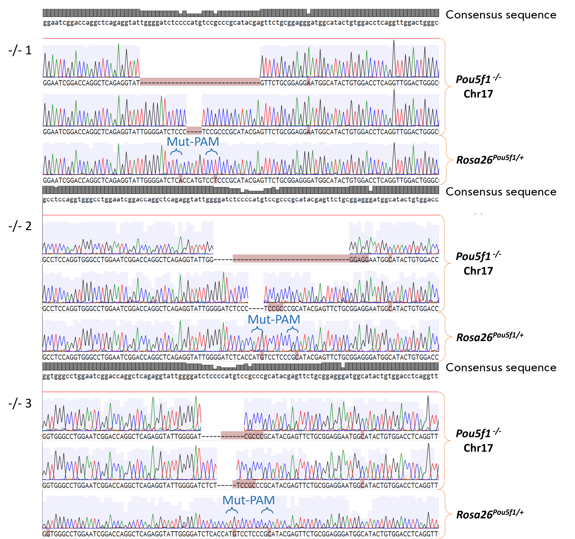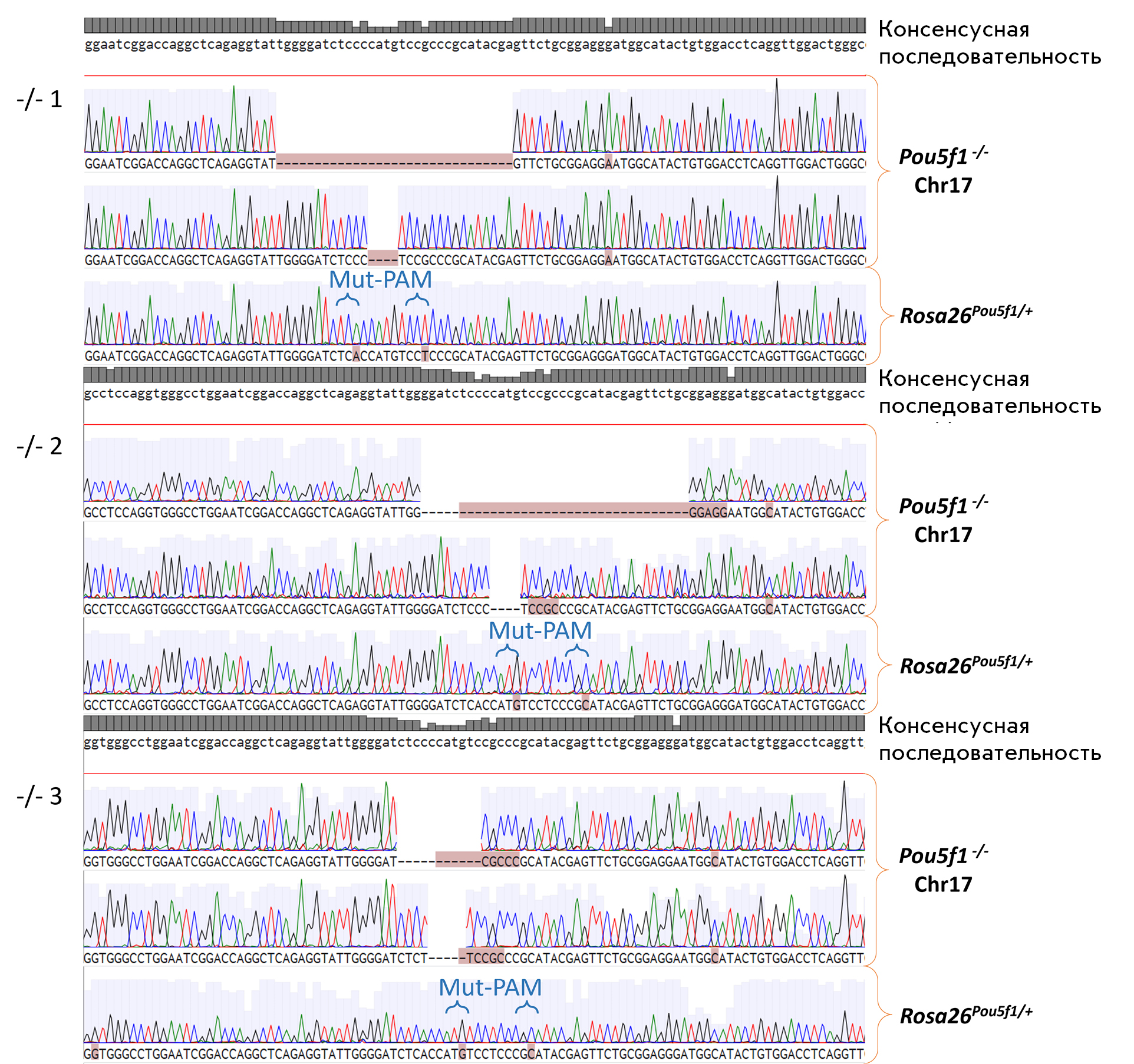 Fig. 2. Sequences of endogenous Pou5f1 alleles from the Pou5f1-/-;Rosa26Pou5f1/+ cell line for three biological replicates. Note: “-/-” 1–3 – numbers of biological replicates for Pou5f1-/-;Rosa26Pou5f1/+ ESCs