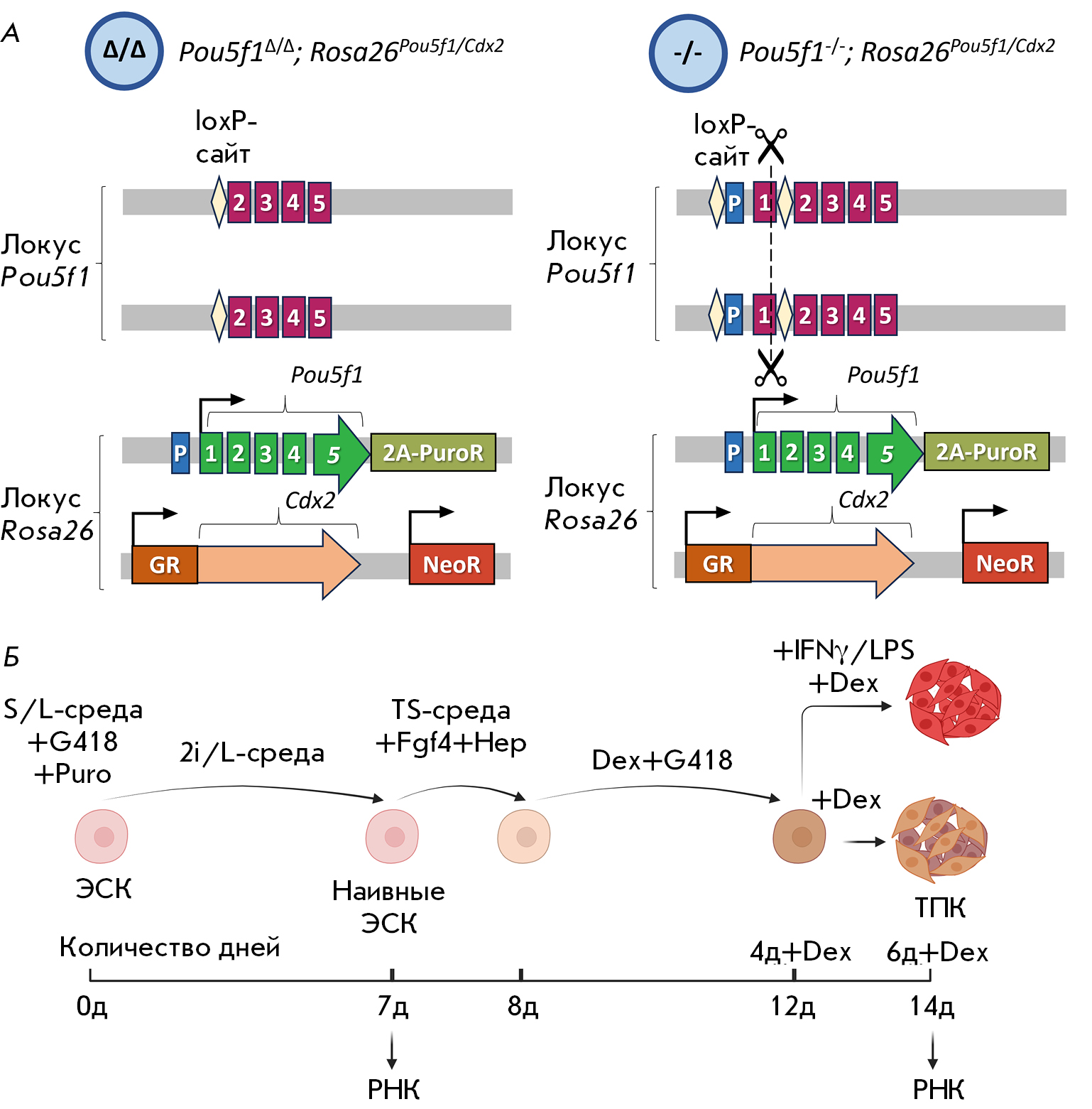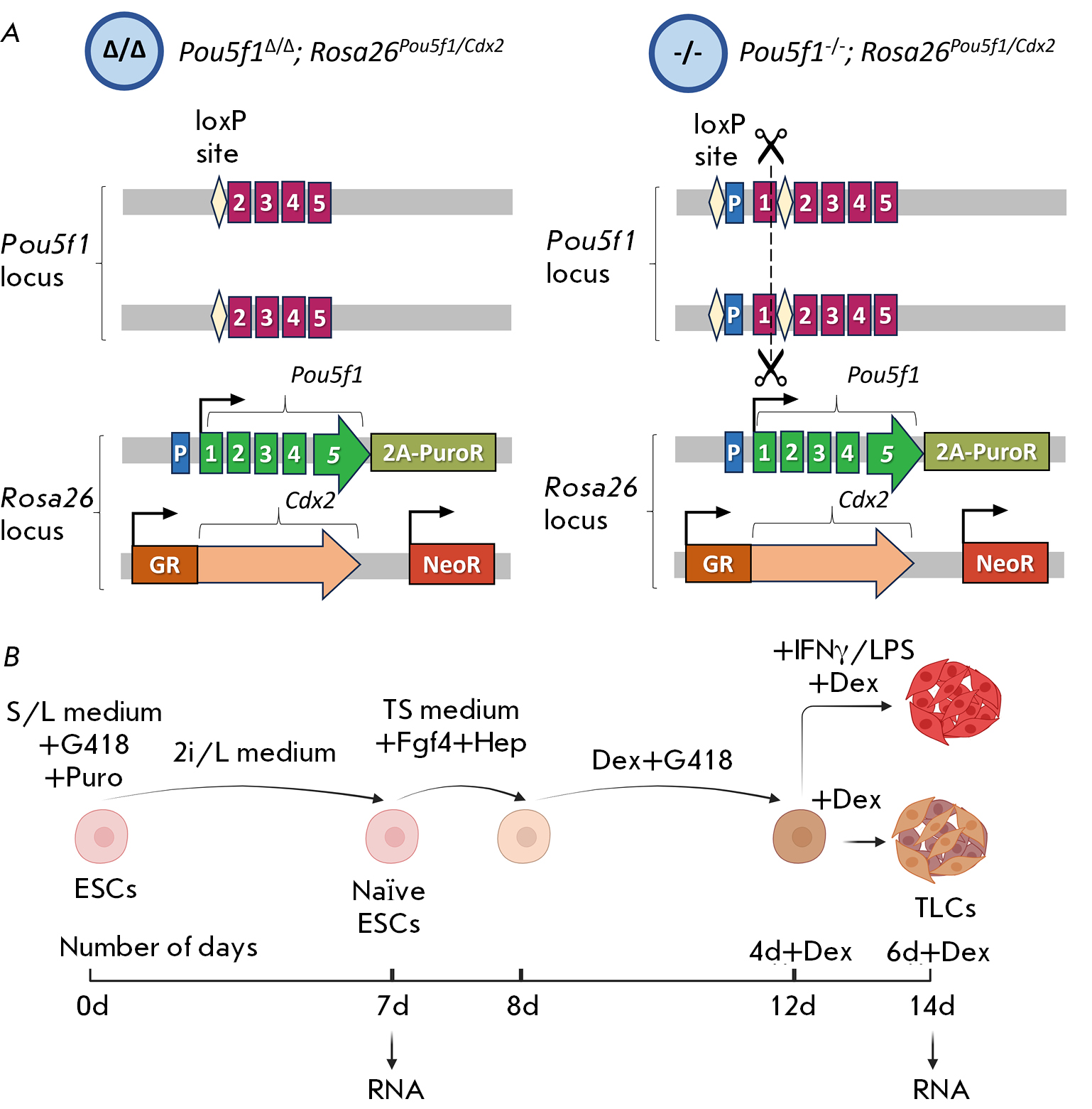 Fig. 3. Cell lines and the experimental protocol. (A) Schematic representation of the experimental embryonic stem cell (ESC) lines. “Δ/Δ” – Pou5f1Δ/Δ; Rosa26Pou5f1/Cdx2 ESC line with a deletion of the endogenous Pou5f1 promoter; “-/-” – Pou5f1-/;Rosa26Pou5f1/Cdx2 ESC line with an intact endogenous promoter and an inactivating indel mutation in the first exon of the gene. P – promoter; 1–5 – exons of the Pou5f1 gene; 2A-PuroR – P2A site followed by the puromycin resistance gene PuroR; GR – ligand-binding domain of the glucocorticoid receptor; NeoR – the G418/neomycin resistance gene. (B) Schematic representation of ESC differentiation towards the trophoblast lineage (see the Materials and Methods section for a detailed description). Fgf4 – fibroblast growth factor 4; Hep – heparin; Dex – dexamethasone; IFNγ – interferon gamma; LPS – lipopolysaccharides; TLCs – trophoblast-like cells. The figure was created using BioRender