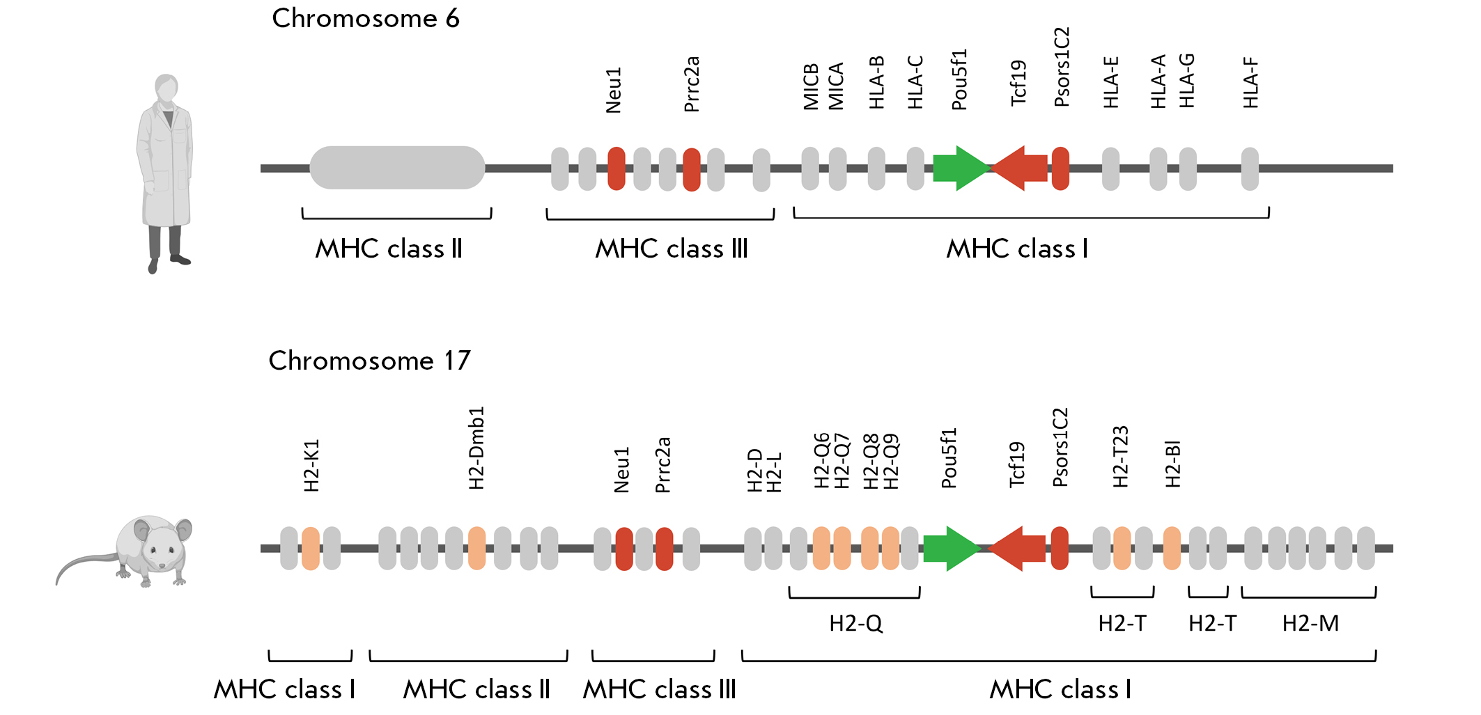Fig. 1. Schematic representation of the Pou5f1-MHC locus. A schematic depiction of the Pou5f1-MHC locus for human (top) and mouse (bottom). Genes analyzed in this study are highlighted: Pou5f1, in green; MHC genes, in orange; the genes potentially interacting with Pou5f1, including Tcf19, in red. The directions of transcription of the Pou5f1 and Tcf19 genes are additionally indicated with arrows. The figure was created using BioRender
