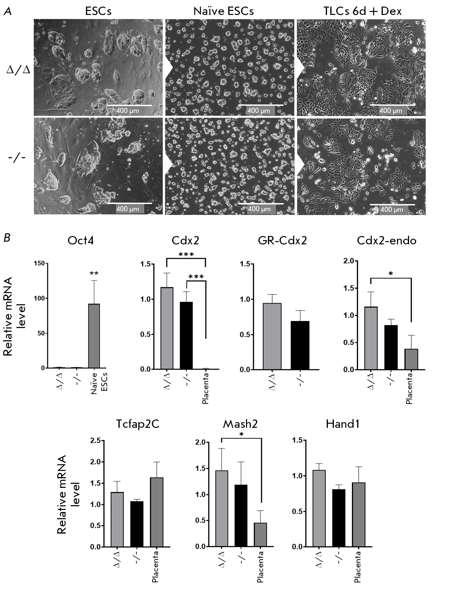 Fig. 4. Validation of the ability of Pou5f1Δ/Δ;Rosa26Pou5f1/Cdx2 and Pou5f1-/-;Rosa26Pou5f1/Cdx2 ESC lines to differentiate towards the trophoblast lineage. (A) Morphological characteristics of cells at different stages of differentiation: serum (S/L) culture conditions (left), naïve (2i/L) culture conditions (middle), and trophectoderm cells induced by Dex treatment for six days (right). (B) Analysis of the expression of trophoblast markers (Cdx2, Tcfap2C, Mash2, and Hand1) during differentiation compared to placenta. Designations are the same as those in Fig. 3A. *P ≤ 0.05; **P ≤ 0.01; ***P ≤ 0.001 according to ANOVA