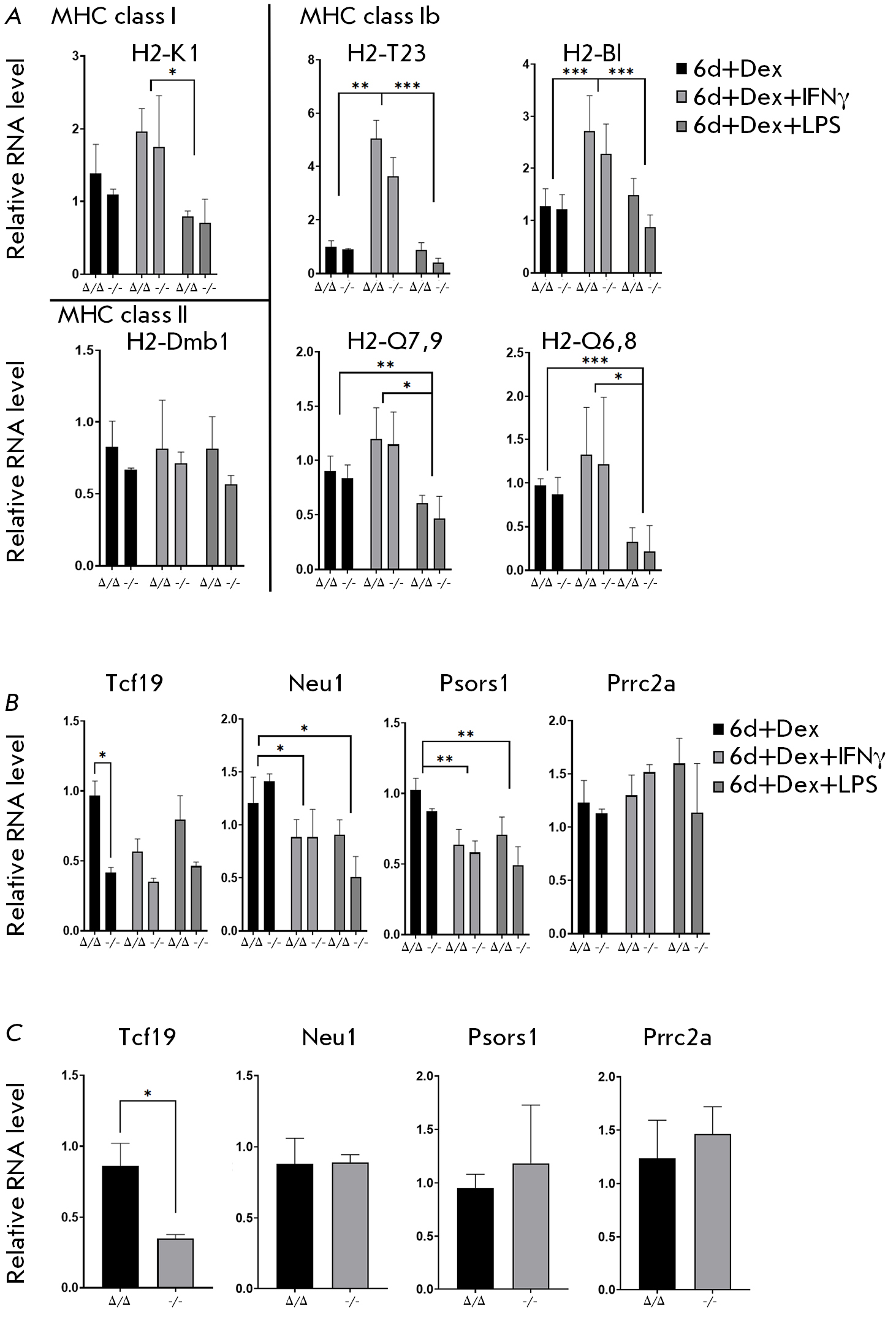 Fig. 5. Comparison of Pou5f1-MHC locus-related gene expression between the Pou5f1Δ/Δ;Rosa26Pou5f1/Cdx2 and Pou5f1-/-;Rosa26Pou5f1/Cdx2 cell lines under standard and pro-inflammatory culture conditions. (A, B) Comparison of the relative mRNA levels between the Pou5f1Δ/Δ;Rosa26Pou5f1/Cdx2 and Pou5f1-/-;Rosa26Pou5f1/Cdx2 ESC lines after six days of culture with dexamethasone (Dex) under standard and pro-inflammatory conditions (with IFNγ or LPS). Panel (A) presents the expression analysis of MHC class I and II genes; panel (B) compares the expression of the genes within the Pou5f1-MHC locus that were previously demonstrated to exhibit cis-regulatory activity towards Pou5f1. (C) Comparison of the expression of the genes from panel (B) in undifferentiated Pou5f1Δ/Δ;Rosa26Pou5f1/Cdx2 and Pou5f1-/-;Rosa26Pou5f1/Cdx2 ESCs cultured under 2i/L conditions. Figure legend is the same as that in Fig. 3A. *P ≤ 0.05; **P ≤ 0.01; ***P ≤ 0.001 according to ANOVA. Comparisons were performed between the “Δ/Δ” and “-/-” cell lines under each culture condition, as well as between different conditions using the Tukey’s test