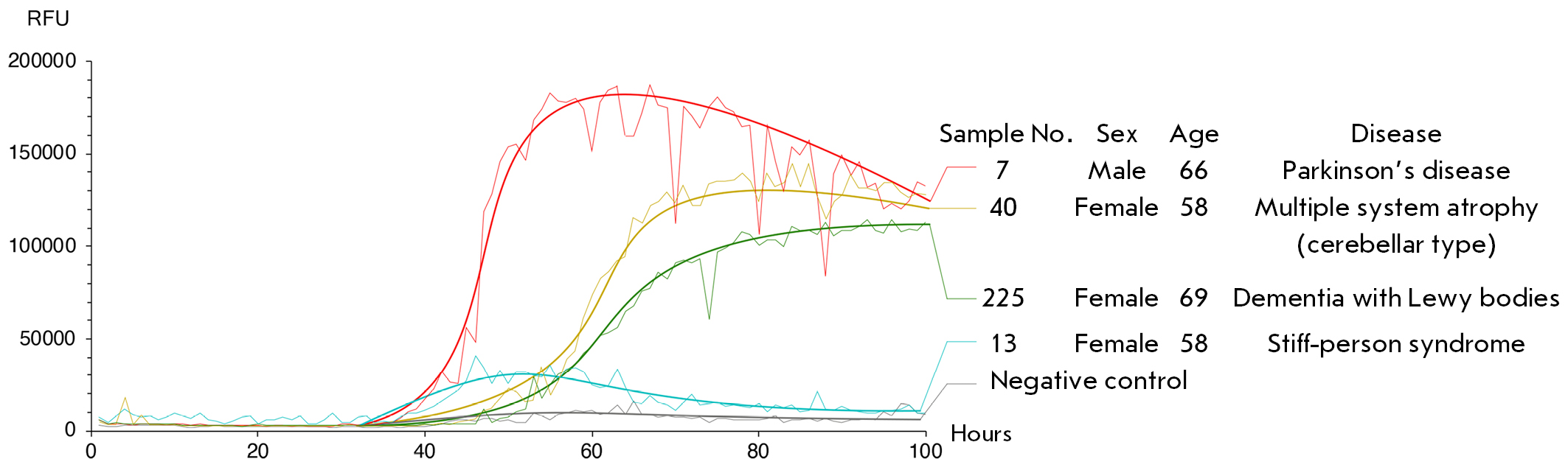 Fig. 3. Curves of pathological α-synuclein amplification in patients (RFU – relative fluorescence units). Analysis of samples from patients with stiff-person syndrome (blue), Lewy body dementia (green), multiple system atrophy of the cerebellar type (yellow), and Parkinson’s disease (red)