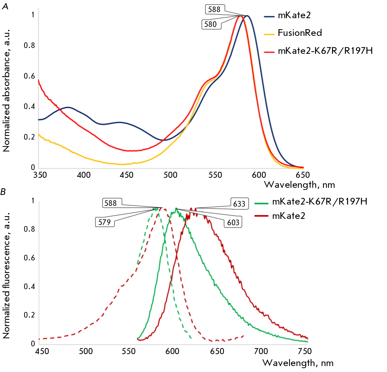 Fig. 1. The absorption (A) and fluorescence (B) spectra of mKate2-K67R/R197H compared to those of its parent mKate2 and close homologue, FusionRed (absorption only). The wavelengths of the maxima of major bands are shown in the bubbles. In the fluorescence graph, dashed lines show fluorescence excitation; solid lines show fluorescence emission