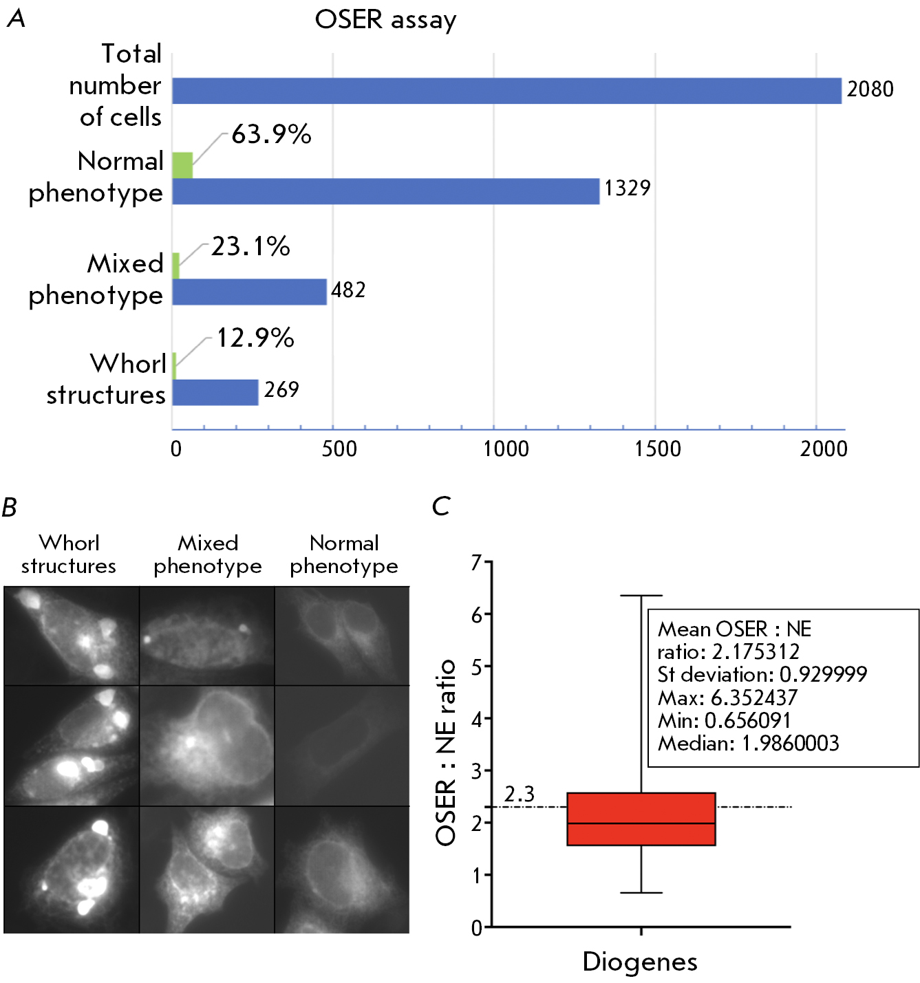 Fig. 2. Summary of the Diogenes examination using the OSER assay. (A) Histogram showing the total cell number (HeLa) and distribution of three phenotypes between them; (B) The gallery of fluorescence images illustrating the phenotypes observed during the OSER-based examination in live HeLa cells. The “Whorl structures” column depicts the cells where homo-oligomerization of the label yielded the typical organized smooth endoplasmic reticulum (OSER) structures (whorls) as they have been earlier described [12, 23]. The “Mixed phenotype” row represents the cases when some labeling artifacts other than typical whorls (small puncta, dots, regions with locally increased brightness) are observed. The “Normal phenotype” row exemplifies the cells with an evenly stained ER tubular network; (C) Graph showing the quantitative analysis of the OSER : NE intensity ratio in live U2OS cells. The red box indicates 25–75 percentile of the readings; whiskers stand for the min and max read of the set. Median is illustrated by a horizontal line within the box; the dash-and-dot line at 2.3 indicates the monomer’s threshold OSER : NE value according to the original paper [23]. Descriptive statistics for the data are shown in the inset