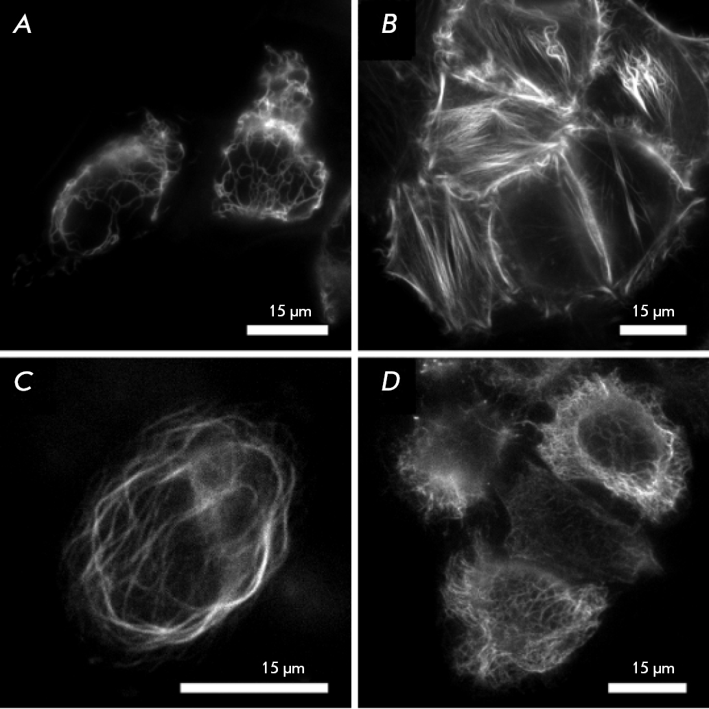 Fig. 3. Fluorescent labeling of intracellular structures with Diogenes in live HeLa Kyoto cells. (A) Vimentin–Diogenes; (B) lifeact–Diogenes; (C) ensconsin–Diogenes; and (D) Diogenes–cytokeratin; Scale bars are 15 μm