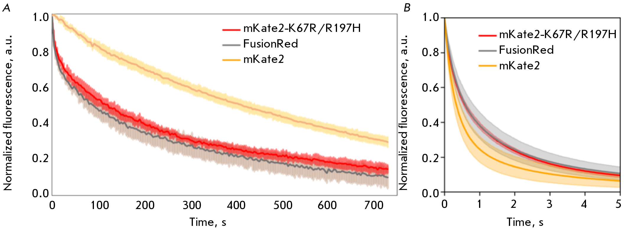 Fig. 4. The photobleaching kinetics of the red fluorescent proteins mKate2-K67R/R197H (Diogenes), mKate2, and FusionRed measured in an aqueous solution of the purified protein at an excitation power density of ~ 2 W/cm2 (A) and live HeLa cells at ~ 1 kW/cm2 (B). Solid lines indicate the mean fluorescence intensity during photobleaching. Transparent areas indicate the standard deviation (five protein-containing particles or 20 cells for each fluorescent protein)