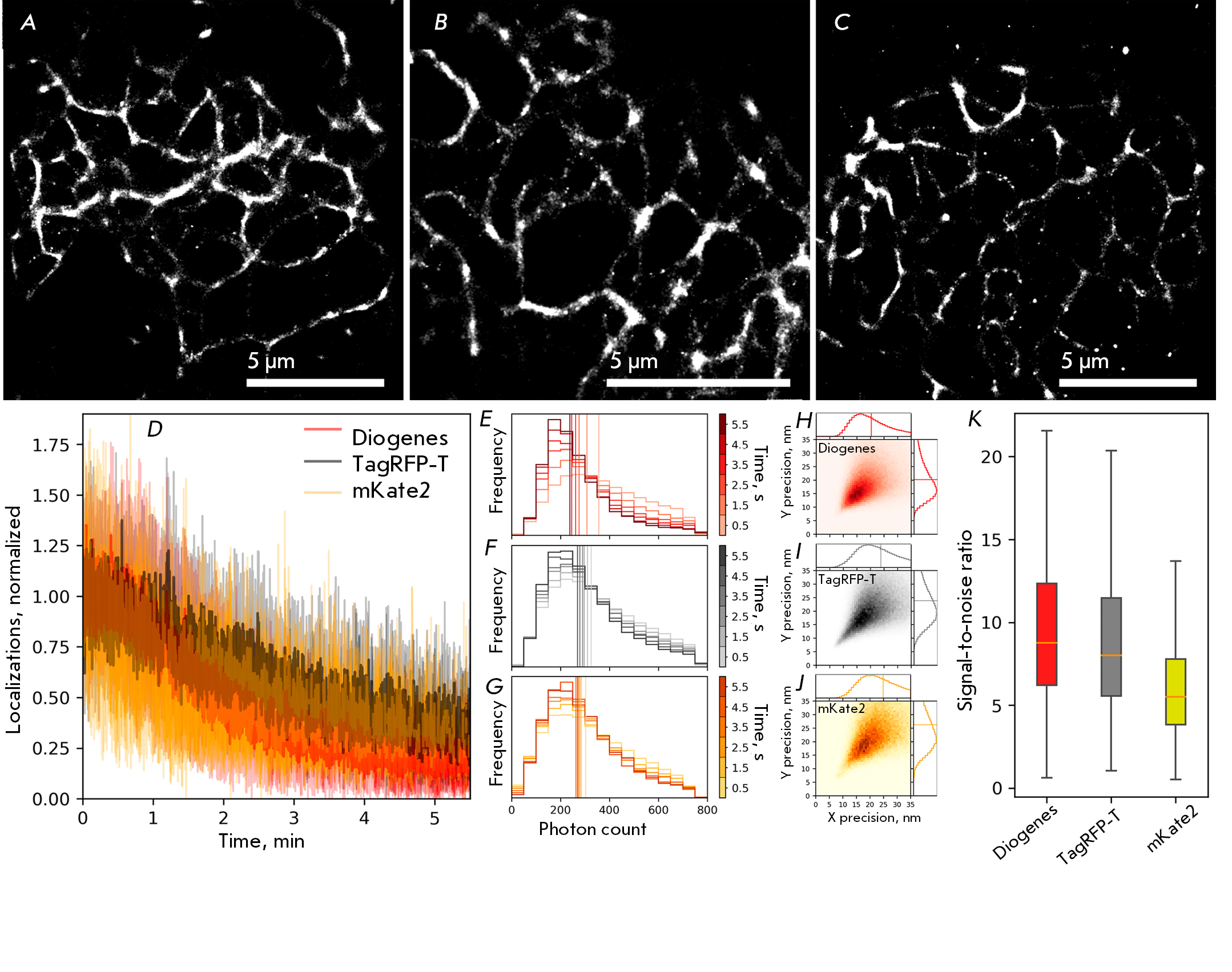 Fig. 5. Comparison of the live-cell super-resolution imaging performance of mKate2-K67R/R197H, TagRFP-T, and mKate2 as parts of vimentin fusion proteins in live HeLa cells under the following imaging conditions: 2 kW/cm2 561 nm laser; 16.7 ms frame time; 20,000 frames. Super-resolution images of live HeLa cells transfected with vimentin–Diogenes, vimentin–TagRFP-T, and vimentin–mKate2, respectively (A), (B), (C); Scale bars are 5 μm. Stability of localization density of Diogenes, TagRFP-T, and mKate2 (D). The histogram of changes in the number of detected photons per single-molecule event over time of Diogenes, TagRFP-T, and mKate2, respectively; vertical lines represent the median values (E), (F), (G). 2D histograms of localization precision per single-molecule event of Diogenes, TagRFP-T, and mKate2, respectively (H), (I), (J); vertical lines on 1D histograms represent the median values. Signal-to-noise ratio of detected localizations (K); whiskers show the standard deviation, orange horizontal lines indicate median values
