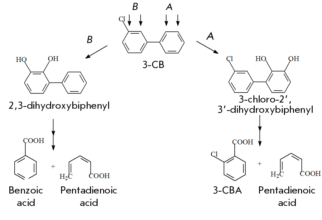 Fig. 1. The scheme of PCB 2 oxidation by the enzymatic system of the strain Rhodococcus sp. FG1 and the main degradation products: (A) the metabolic pathway begins with oxidation of 2 and 3 carbon atoms in the unsubstituted ring of the biphenyl molecule; (B) the metabolic pathway begins with oxidation of 2 and 3 carbon atoms in the substituted ring of the biphenyl molecule
