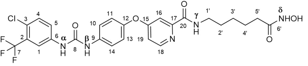 4-(4-(3-(4-chloro-3-(trifluoromethyl)phenyl)ureido)phenoxy)-N-(6-(hydroxyamino)-6-oxohexyl)picolinamide (SRF-CHA). A solution of 363 mg (0.643 mmol) of SRF-CA in 0.7 mL of DMF was combined with 115 mg (0.71 mmol) of CDI. After 1 h 40 min, 70 mg (1.00 mmol) of hydroxylamine hydrochloride was added, stirred until dissolved for 10 min, and left for 2 h. The reaction mixture was diluted with 3.5 mL of H2O and cooled at 10°C for 18 h. The supernatant was decanted, and the precipitated oil was triturated in 7 mL of cold water until the formation of a loose sediment, filtered, and dried in air. The product was isolated by chromatography on a silica gel using a CHCl3–EtOH (first 7.5 : 1 and then 5 : 1) mixture as an eluent. The collected fractions were evaporated to yield 262 mg (70%) of SRF-CHA. 1H NMR (DMSO-d6): δ 10.30 (1H, s, NHd), 9.23 (1H, s, NHα), 9.01 (1H, s, NHb), 8.75 (1H, t, J 5.9, NHγ), 8.63 (1H, s, OH), 8.51 (1H, d, J 5.5, H18), 8.13 (1H, s, H16), 7.74–7.54 (4H, m, H4, H10 and H14, H19), 7.39 (1H, d, J 2.3, H1), 7.22–7.12 (3H, m, H5, H11, and H13), 3.25 (2H, q, J 6.6, H1′), 1.94 (2H, t, J 7.3, H5′), 1.61–1.41 (4H, m, H2′ and H4′), 1.34–1.17 (2H, m, H3′). 13C NMR (DMSO-d6): δ 169.57 (C6′), 166.47 (C15), 163.60 (C20), 152.95 (C8 and C17), 150.77 (C18), 148.35 (C12), 139.79 (C9), 137.51 (C6), 132.44 (C4 or C5), 127.21 (q, J 30.7, C2), 123.58 (C4 or C5), 123.29 (q, J 273, C7), 122.85 (C3), 121.89 (C10 and C14), 121.00 (C11 and C13), 117.33 (q, J 5.5, C1), 114.54 (C19), 109.24 (C16), 39.21 (C1′), 32.67 (C5′), 29.34 (C2′), 26.49 (C3′), 25.33 (C4′). 19F NMR (DMSO-d6): δ ‒61.47 (CF3).
